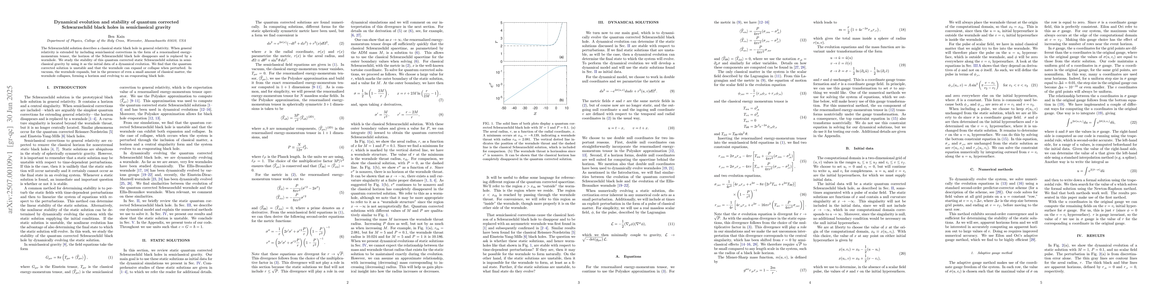 The Schwarzschild solution describes a classical static black hole in general relativity. When general relativity is extended by including semiclassical corrections in the form of a renormalized energy-momentum tensor, the horizon of the Schwarzschild black hole disappears and is replaced by a wormhole. We study the stability of this quantum corrected static Schwarzschild solution in semiclassical gravity by using it as the initial data of a dynamical evolution. We find that the quantum corrected solution is unstable and that the wormhole can expand or collapse when perturbed. In vacuum, the wormhole expands, but in the presence of even a small amount of classical matter, the wormhole collapses, forming a horizon and evolving to an evaporating black hole.