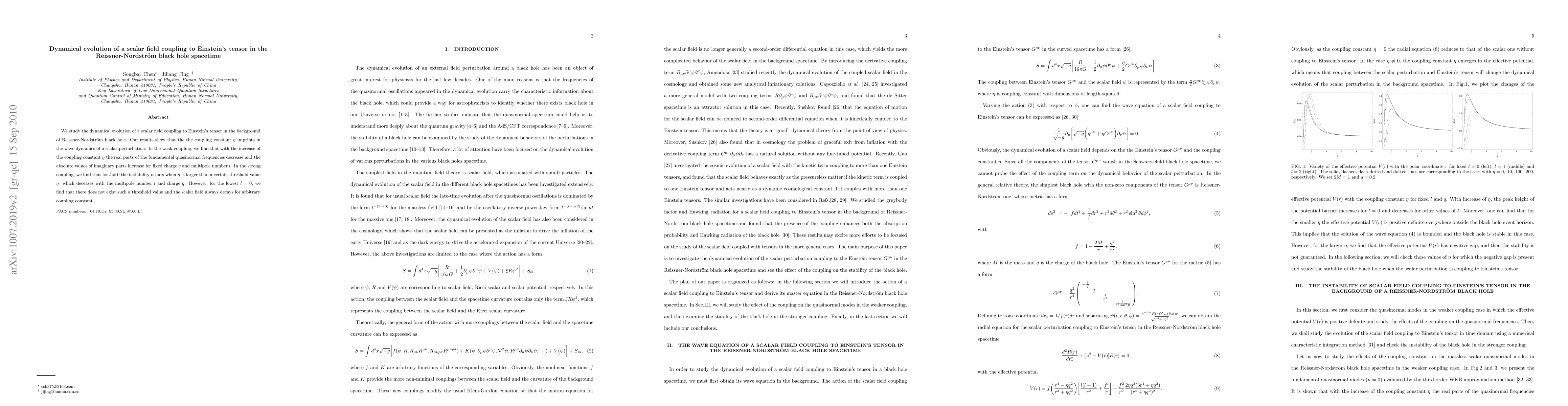 We study the dynamical evolution of a scalar field coupling to Einstein's tensor in the background of Reissner-Nordstr\"{o}m black hole. Our results show that the the coupling constant $\eta$ imprints in the wave dynamics of a scalar perturbation. In the weak coupling, we find that with the increase of the coupling constant $\eta$ the real parts of the fundamental quasinormal frequencies decrease and the absolute values of imaginary parts increase for fixed charge $q$ and multipole number $l$. In the strong coupling, we find that for $l\neq0$ the instability occurs when $\eta$ is larger than a certain threshold value $\eta_c$ which deceases with the multipole number $l$ and charge $q$. However, for the lowest $l=0$, we find that there does not exist such a threshold value and the scalar field always decays for arbitrary coupling constant.