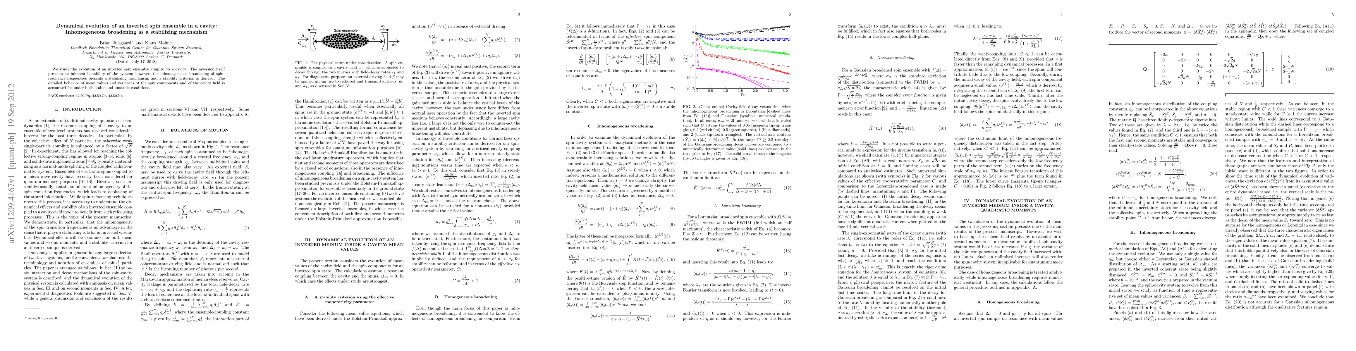 This paper investigates the dynamical evolution of an inverted spin ensemble within a cavity, focusing on how inhomogeneous broadening stabilizes the system despite inherent instability. A stability criterion is derived, and the behavior of spin components and cavity field mean values and variances is analyzed under both stable and unstable conditions.