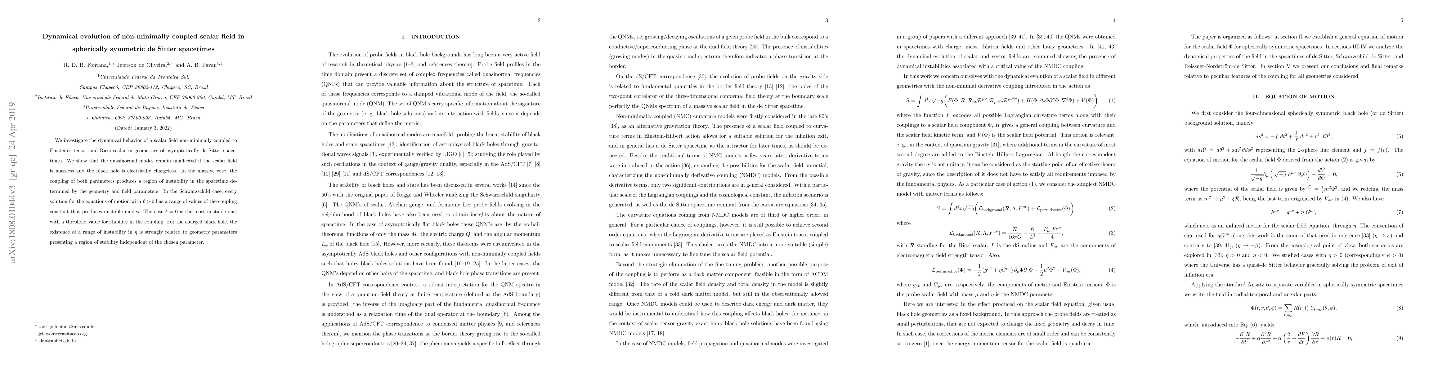 We investigate the dynamical behavior of a scalar field non-minimally coupled to Einstein's tensor and Ricci scalar in geometries of asymptotically de Sitter spacetimes. We show that the quasinormal modes remain unaffected if the scalar field is massless and the black hole is electrically chargeless. In the massive case, the coupling of both parameters produces a region of instability in the spacetime determined by the geometry and field parameters. In the Schwarzschild case, every solution for the equations of motion with $\ell>0$ has a range of values of the coupling constant that produces unstable modes. The case $\ell=0$ is the most unstable one, with a threshold value for stability in the coupling. For the charged black hole, the existence of a range of instability in $\eta$ is strongly related to geometry parameters presenting a region of stability independent of the chosen parameter.