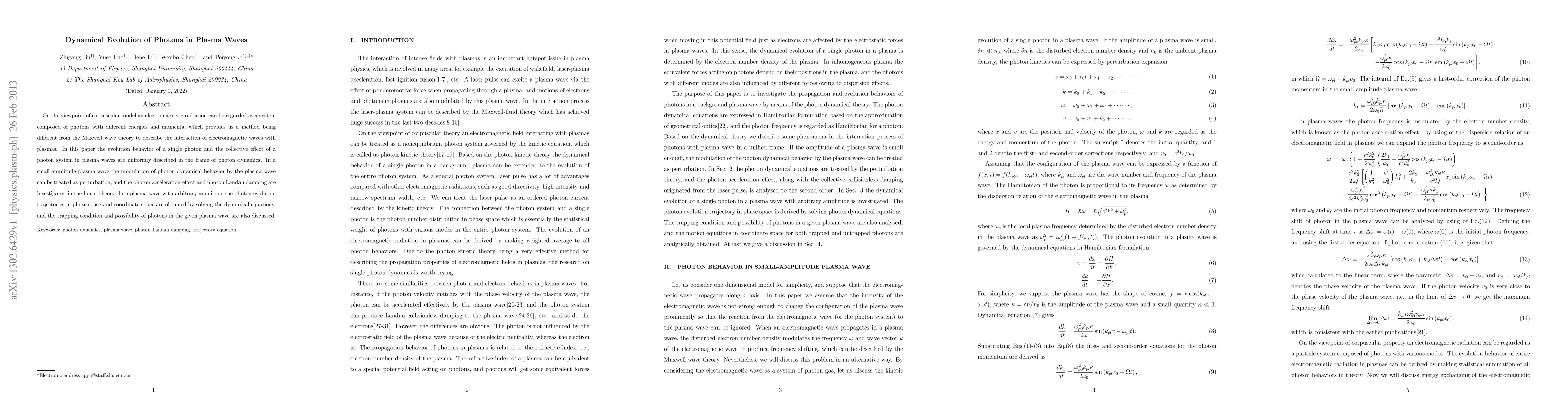 This paper explores the dynamical evolution of photons in plasma waves using the corpuscular model, contrasting it with the Maxwell wave theory. It investigates both single photon behavior and collective effects in plasma waves, examining photon acceleration, damping, and trapping conditions through both linear perturbation theory and dynamical equations.
