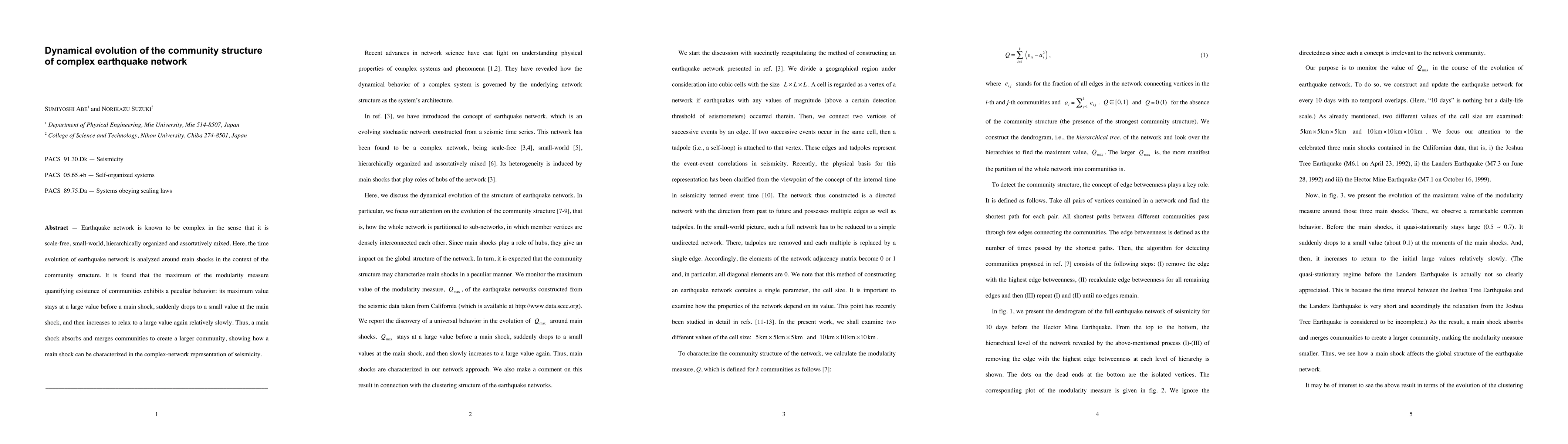 This paper analyzes the dynamical evolution of the community structure in an earthquake network, revealing that main shocks cause a sudden drop in modularity, indicating community merging, followed by a gradual increase, highlighting how seismic events can be characterized through complex network dynamics.