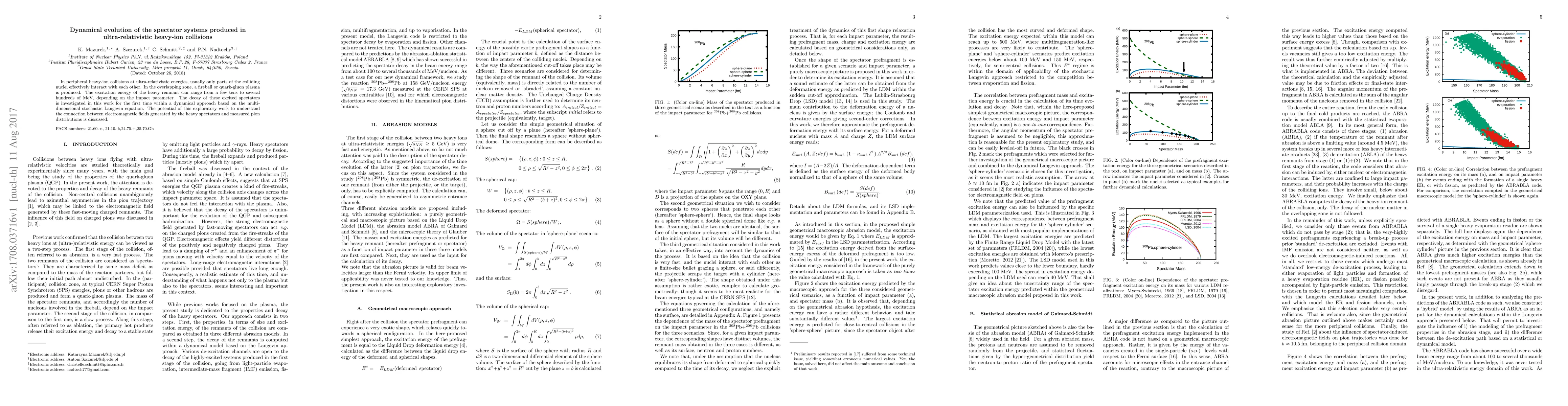 In peripheral heavy-ion collisions at ultra-relativistic energies, usually only parts of the colliding nuclei effectively interact with each other. In the overlapping zone, a fireball or quark-gluon plasma is produced. The excitation energy of the heavy remnant can range from a few tens to several hundreds of MeV, depending on the impact parameter. The decay of these excited spectators is investigated in this work for the first time within a dynamical approach based on the multi-dimensional stochastic Langevin equation. The potential of this exploratory work to understand the connection between electromagnetic fields generated by the heavy spectators and measured pion distributions is discussed.