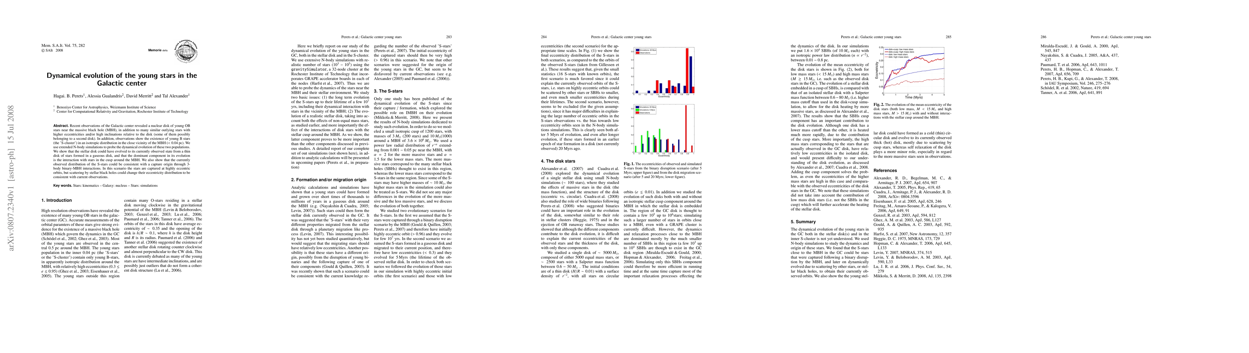 Recent observations of the Galactic center revealed a nuclear disk of young OB stars near the massive black hole (MBH), in addition to many similar outlying stars with higher eccentricities and/or high inclinations relative to the disk (some of them possibly belonging to a second disk). In addition, observations show the existence of young B stars (the 'S-cluster') in an isotropic distribution in the close vicinity of the MBH ($<0.04$ pc). We use extended N-body simulations to probe the dynamical evolution of these two populations. We show that the stellar disk could have evolved to its currently observed state from a thin disk of stars formed in a gaseous disk, and that the dominant component in its evolution is the interaction with stars in the cusp around the MBH. We also show that the currently observed distribution of the S-stars could be consistent with a capture origin through 3-body binary-MBH interactions. In this scenario the stars are captured at highly eccentric orbits, but scattering by stellar black holes could change their eccentricity distribution to be consistent with current observations.