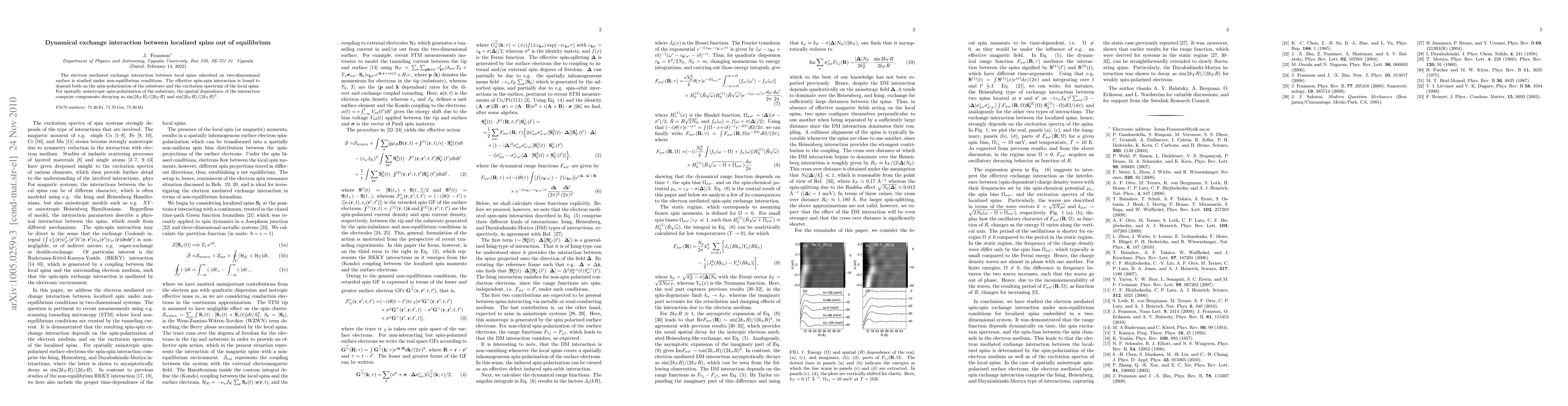 The electron mediated exchange interaction between local spins adsorbed on two-dimensional surface is studied under non-equilibrium conditions. The effective spin-spin interaction is found to depend both on the spin-polarization of the substrate and the excitation spectrum of the local spins. For spatially anisotropic spin-polarization of the substrate, the spatial dependence of the interaction comprise components decaying as sin(2k_FR)/(2k_FR) and sin(2k_FR)/(2k_FR)^2.