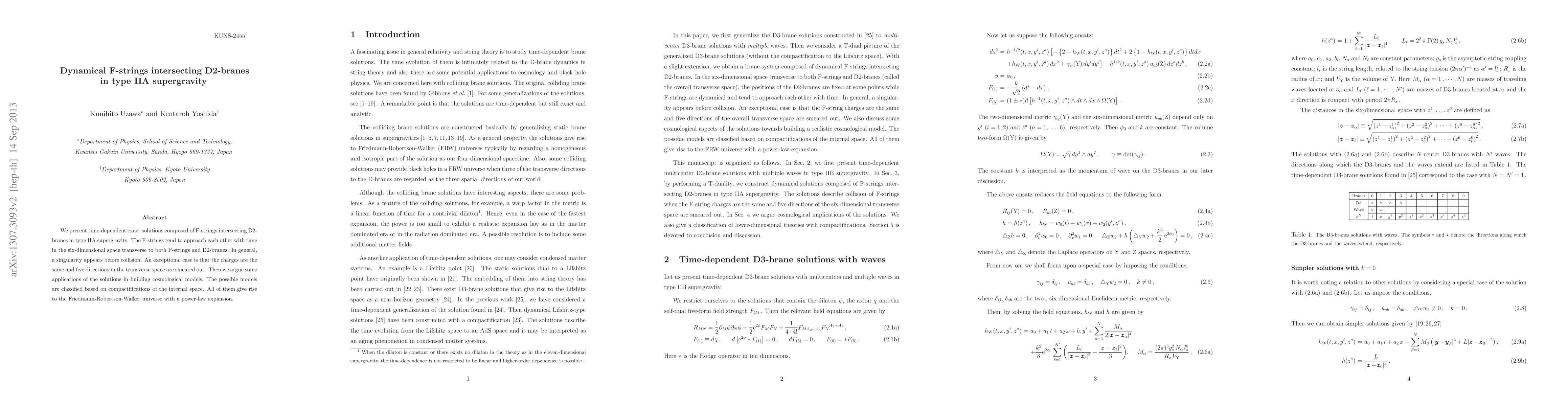 This paper presents time-dependent exact solutions for F-strings intersecting D2-branes in type IIA supergravity, showing that F-strings generally approach each other and may form singularities before collision. In special cases, the same charges smear out five transverse directions, leading to applications in constructing cosmological models with power-law expansions.