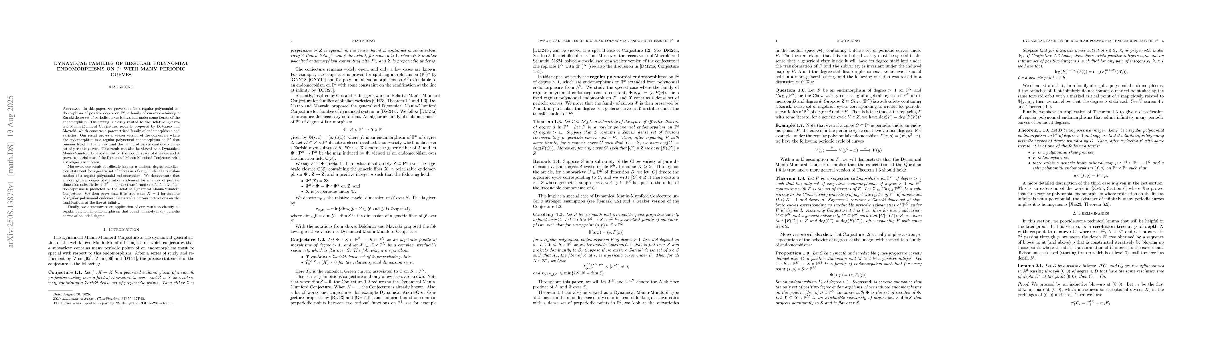 In this paper, we prove that for a regular polynomial endomorphism of positive degree on $\mathbb{P}^2$, a family of curves containing a Zariski dense set of periodic curves is invariant under some iterate of the endomorphism. The setting is closely related to the Relative Dynamical Manin-Mumford Conjecture, recently proposed by DeMarco and Mavraki, which concerns a parametrized family of endomorphisms and varieties. Our result proves a weaker version of the conjecture where the endomorphism is a regular polynomial endomorphism on $\mathbb{P}^2$ that remains fixed in the family, and the family of curves contains a dense set of periodic curves. This result can also be viewed as a Dynamical Manin-Mumford type statement on the moduli space of divisors, and it proves a special case of the Dynamical Manin-Mumford Conjecture with a stronger assumption. Moreover, our result specifically implies a uniform degree stabilization statement for a generic set of curves in a family under the transformation of a regular polynomial endomorphism. We demonstrate that a more general degree stabilization statement for a family of positive dimension subvarieties in $\mathbb{P}^K$ under the transformation of a family of endomorphisms is predicted by the Relative Dynamical Manin-Mumford Conjecture. We then prove that it is true when $K=2$ for families of regular polynomial endomorphisms under certain restrictions on the ramifications at the line at infinity. Finally, we demonstrate an application of our result to classify all regular polynomial endomorphisms that admit infinitely many periodic curves of bounded degree.