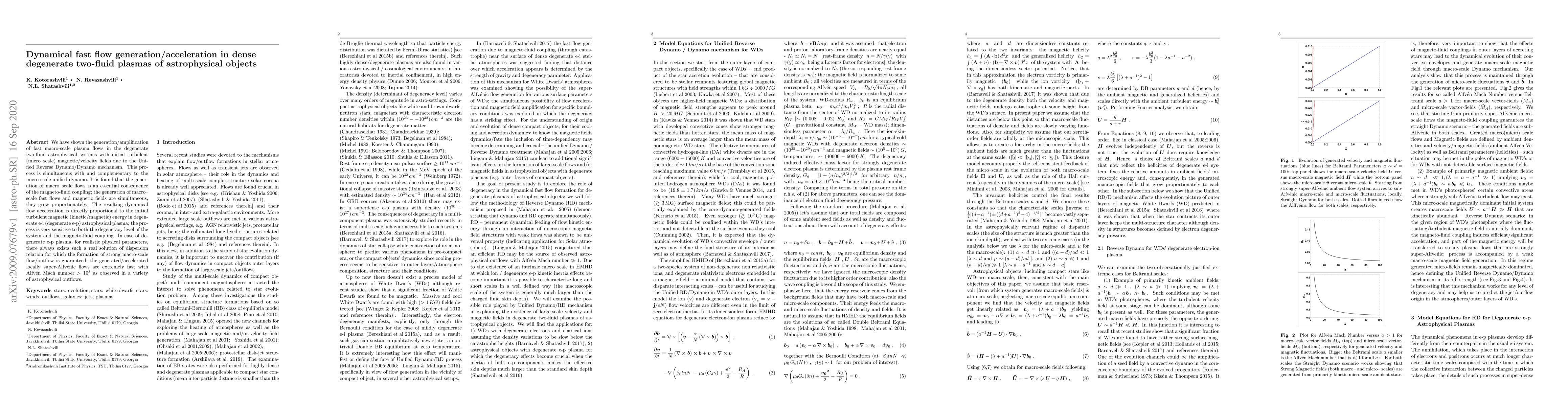 We have shown the generation/amplification of fast macro-scale plasma flows in the degenerate two-fluid astrophysical systems with initial turbulent (micro--scale) magnetic/velocity fields due to the Unified Reverse Dynamo/Dynamo mechanism. This process is simultaneous with and complementary to the micro-scale unified dynamo. It is found that the generation of macro--scale flows is an essential consequence of the magneto-fluid coupling; the generation of macro--scale fast flows and magnetic fields are simultaneous, they grow proportionately. The resulting dynamical flow acceleration is directly proportional to the initial turbulent magnetic (kinetic/magnetic) energy in degenerate e-i (degenerate e-p) astrophysical plasma; the process is very sensitive to both the degeneracy level of the system and the magneto-fluid coupling. In case of degenerate e-p plasma, for realistic physical parameters, there always exists such a real solution of dispersion relation for which the formation of strong macro-scale flow/outflow is guaranteed; the generated/accelerated locally super-Alfv\'enic flows are extremely fast with Alfv\'en Mach number $> 10^3$ as observed in a variety of astrophysical outflows