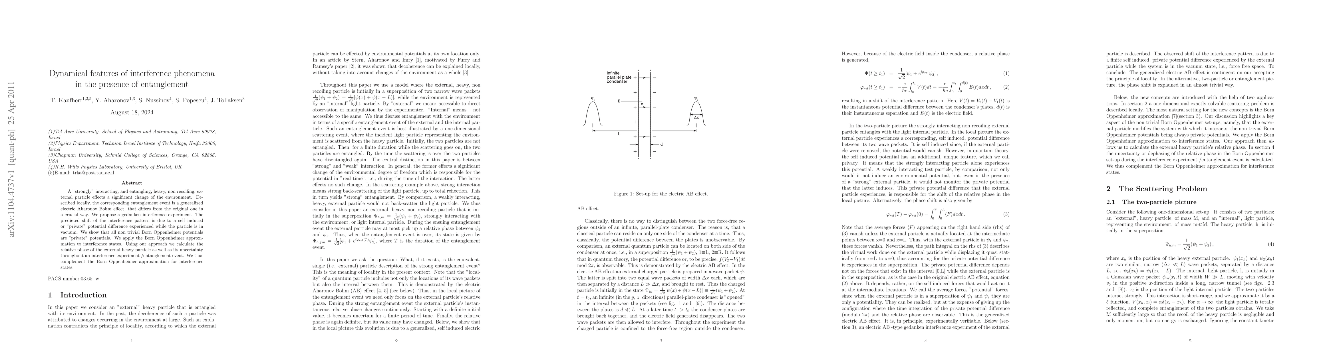 A "strongly" interacting, and entangling, heavy, non recoiling, external particle effects a significant change of the environment. Described locally, the corresponding entanglement event is a generalized electric Aharonov Bohm effect, that differs from the original one in a crucial way. We propose a gedanken interference experiment. The predicted shift of the interference pattern is due to a self induced or "private" potential difference experienced while the particle is in vacuum. We show that all non trivial Born Oppenheimer potentials are "private" potentials. We apply the Born Oppenheimer approximation to interference states. Using our approach we calculate the relative phase of the external heavy particle as well as its uncertainty throughout an interference experiment /entanglement event. We thus complement the Born Oppenheimer approximation for interference states.