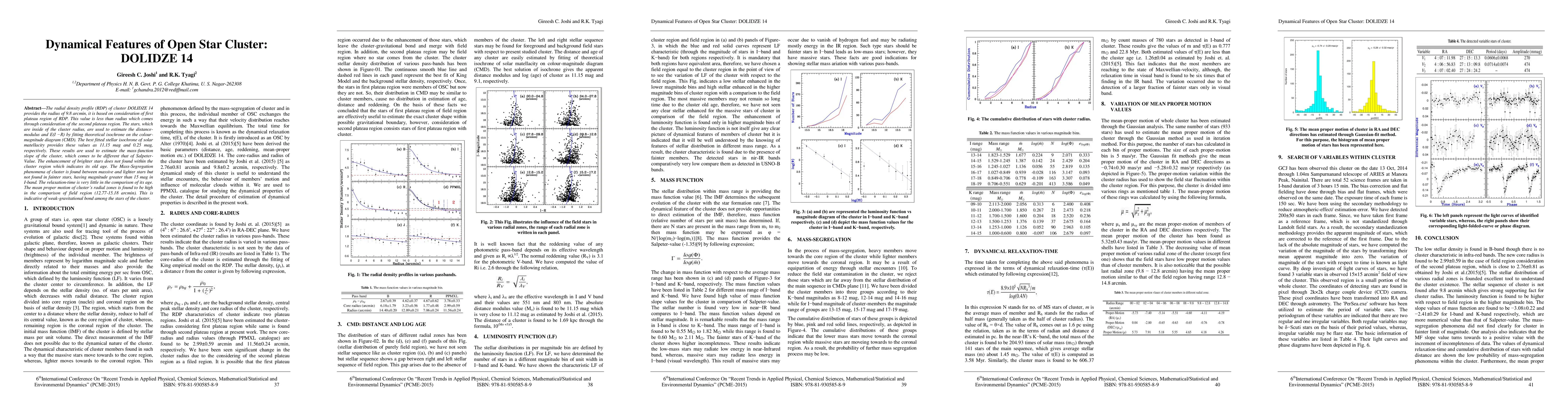 The radial density profile (RDP) of cluster DOLIDZE 14 provides the radius of 9.8 arcmin, it is based on consideration of first plateau region of RDP. This value is less than the radius which comes through consideration of the second plateau region. The stars, which are inside of the cluster radius, are used to estimate the distance-modulus and E(I-R) by fitting theoretical isochrone on the colour-magnitude diagram (CMD). The best fitted stellar isochrone of solar matellacity provides these values as 11.15 mag and 0.25 mag, respectively. These results are used to estimate the mass-function slope of the cluster, which comes to be different that of Salpeter-Value. The enhancement of brighter stars does not found within the cluster region which indicates its old age. The Mass-Segregation phenomena of cluster is found between massive and lighter stars but not found in fainter stars, having magnitude greater than 15 mag in I-band. The relaxation-time is very little in the comparison of its age. The mean proper motion of cluster's radial zones is found to be high in the comparison of field region (12.77-15.18 arcmin). This is indicative of weak-gravitational bond among the stars of the cluster.
