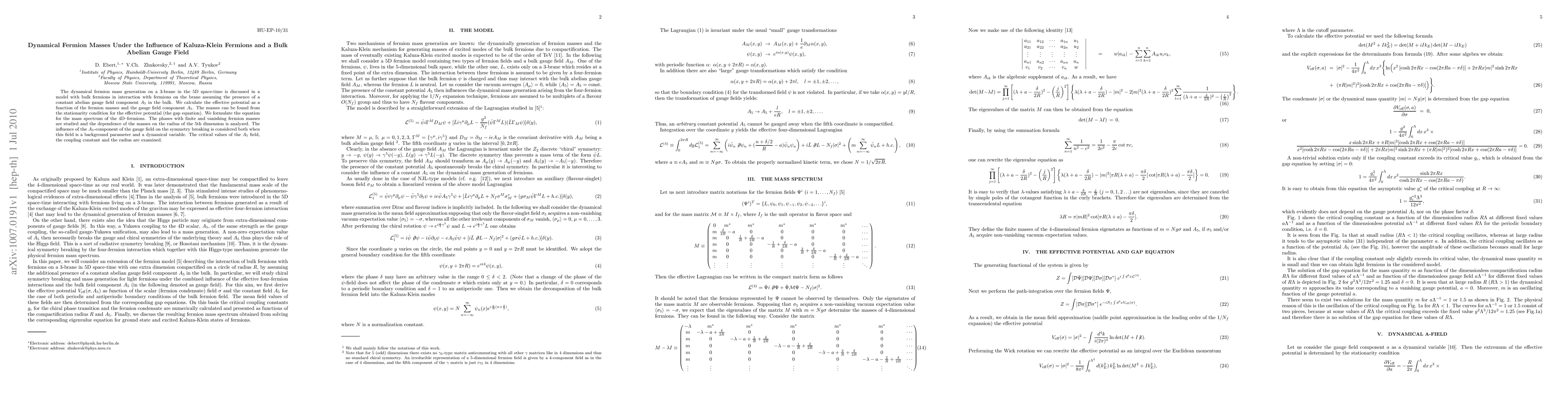 The dynamical fermion mass generation on a 3-brane in the 5D space-time is discussed in a model with bulk fermions in interaction with fermions on the brane assuming the presence of a constant abelian gauge field component $A_5$ in the bulk. We calculate the effective potential as a function of the fermion masses and the gauge field component $A_5$. The masses can be found from the stationarity condition for the effective potential (the gap equation). We formulate the equation for the mass spectrum of the 4D--fermions. The phases with finite and vanishing fermion masses are studied and the dependence of the masses on the radius of the 5th dimension is analyzed. The influence of the $A_5$-component of the gauge field on the symmetry breaking is considered both when this field is a background parameter and a dynamical variable. The critical values of the $A_5$ field, the coupling constant and the radius are examined.