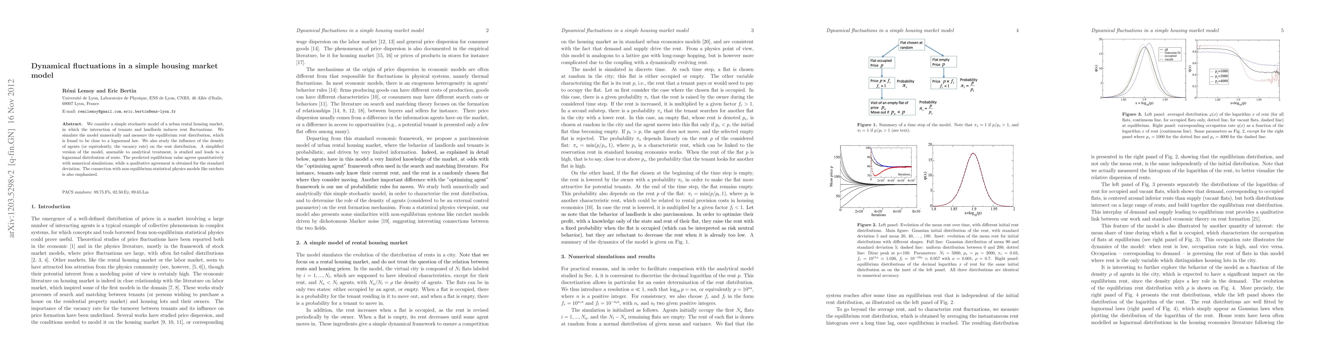 We consider a simple stochastic model of a urban rental housing market, in which the interaction of tenants and landlords induces rent fluctuations. We simulate the model numerically and measure the equilibrium rent distribution, which is found to be close to a lognormal law. We also study the influence of the density of agents (or equivalently, the vacancy rate) on the rent distribution. A simplified version of the model, amenable to analytical treatment, is studied and leads to a lognormal distribution of rents. The predicted equilibrium value agrees quantitatively with numerical simulations, while a qualitative agreement is obtained for the standard deviation. The connection with non-equilibrium statistical physics models like ratchets is also emphasized.