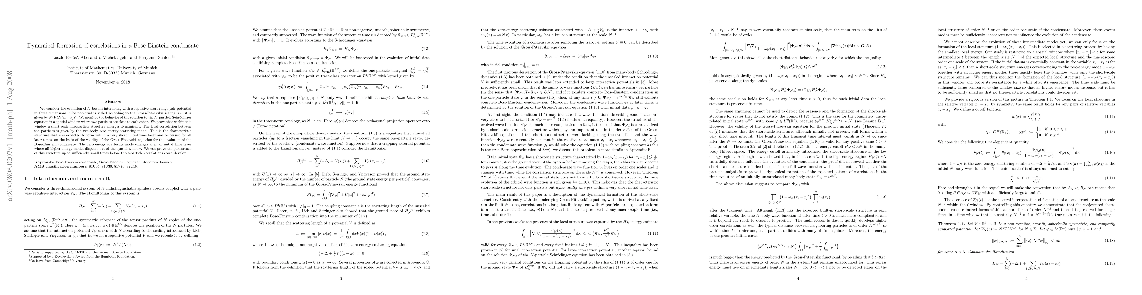 We consider the evolution of $N$ bosons interacting with a repulsive short range pair potential in three dimensions. The potential is scaled according to the Gross-Pitaevskii scaling, i.e. it is given by $N^2V(N(x_i-x_j))$. We monitor the behavior of the solution to the $N$-particle Schr\"odinger equation in a spatial window where two particles are close to each other. We prove that within this window a short scale interparticle structure emerges dynamically. The local correlation between the particles is given by the two-body zero energy scattering mode. This is the characteristic structure that was expected to form within a very short initial time layer and to persist for all later times, on the basis of the validity of the Gross-Pitaevskii equation for the evolution of the Bose-Einstein condensate. The zero energy scattering mode emerges after an initial time layer where all higher energy modes disperse out of the spatial window. We can prove the persistence of this structure up to sufficiently small times before three-particle correlations could develop.