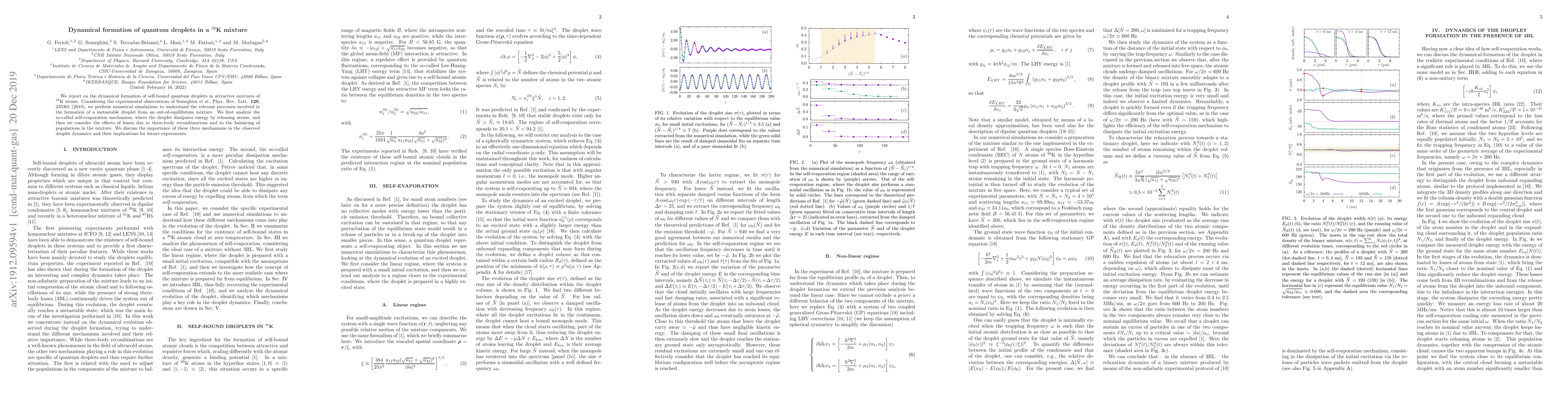 We report on the dynamical formation of self-bound quantum droplets in attractive mixtures of $^{39}$K atoms. Considering the experimental observations of Semeghini et al., Phys. Rev. Lett. 120, 235301 (2018), we perform numerical simulations to understand the relevant processes involved in the formation of a metastable droplet from an out-of-equilibrium mixture. We first analyze the so-called self-evaporation mechanism, where the droplet dissipates energy by releasing atoms, and then we consider the effects of losses due to three-body recombinations and to the balancing of populations in the mixture. We discuss the importance of these three mechanisms in the observed droplet dynamics and their implications for future experiments.