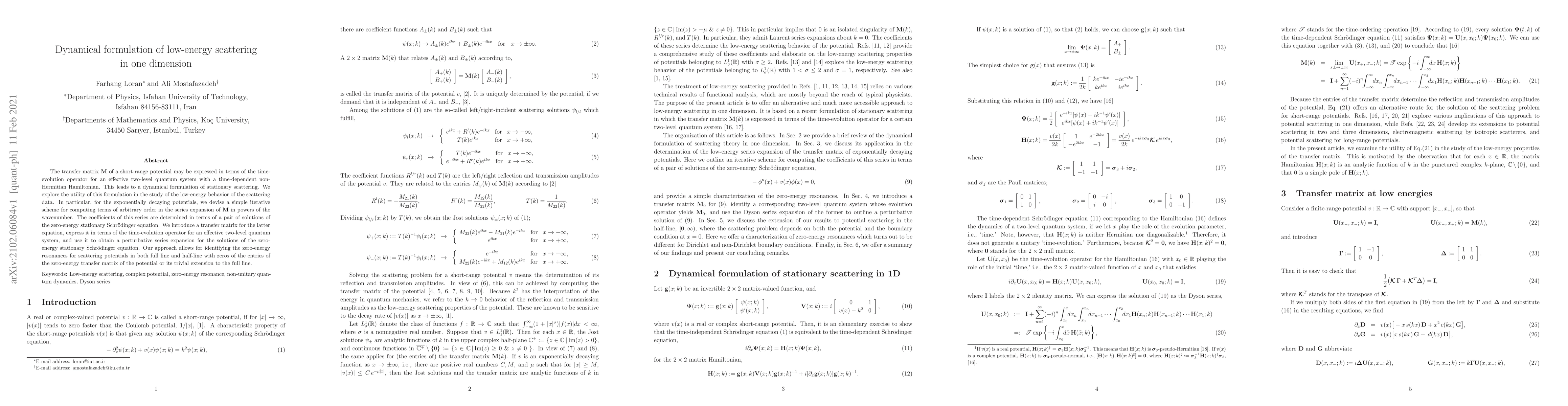 This paper presents a dynamical formulation for low-energy scattering in one dimension using a transfer matrix linked to a time-evolution operator for a two-level quantum system. It introduces an iterative scheme for computing the matrix's terms and identifies zero-energy resonances through the zero-energy transfer matrix.