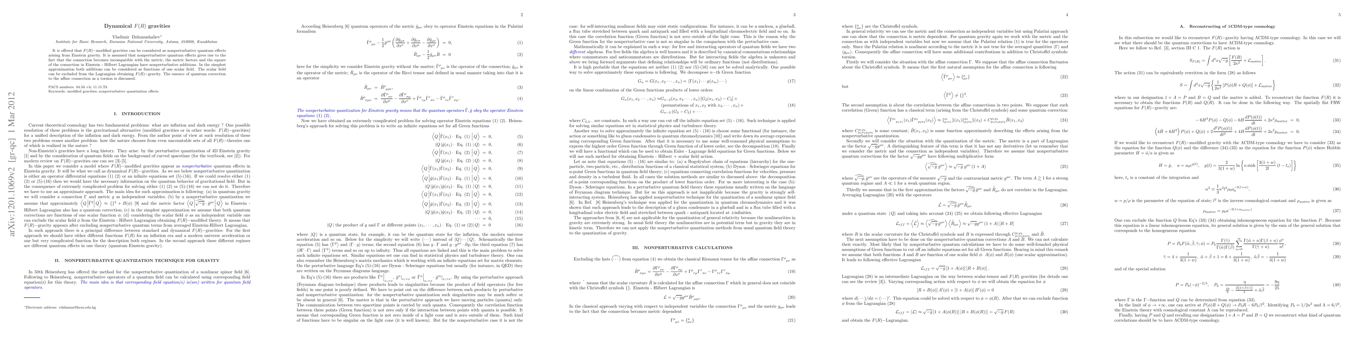It is offered that $F(R)-$modified gravities can be considered as nonperturbative quantum effects arising from Einstein gravity. It is assumed that nonperturbative quantum effects gives rise to the fact that the connection becomes incompatible with the metric, the metric factors and the square of the connection in Einstein - Hilbert Lagrangian have nonperturbative additions. In the simplest approximation both additions can be considered as functions of one scalar field. The scalar field can be excluded from the Lagrangian obtaining $F(R)-$gravity. The essence of quantum correction to the affine connection as a torsion is discussed.