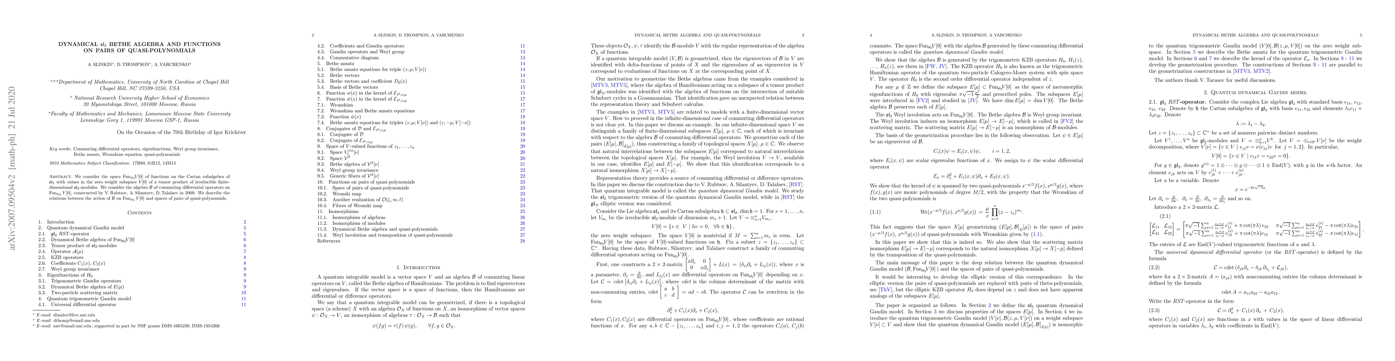 We consider the space $\text{Fun}_{\frak{sl}_2}V[0]$ of functions on the Cartan subalgebra of $\frak{sl}_2$ with values in the zero weight subspace $V[0]$ of a tensor product of irreducible finite-dimensional $\frak{sl}_2$-modules. We consider the algebra $\mathcal B$ of commuting differential operators on $\text{Fun}_{\frak{sl}_2}\,V[0]$, constructed by V.Rubtsov, A.Silantyev, D.Talalaev in 2009. We describe the relations between the action of $\mathcal B$ on $\text{Fun}_{\frak{sl}_2}V[0]$ and spaces of pairs of quasi-polynomials.
