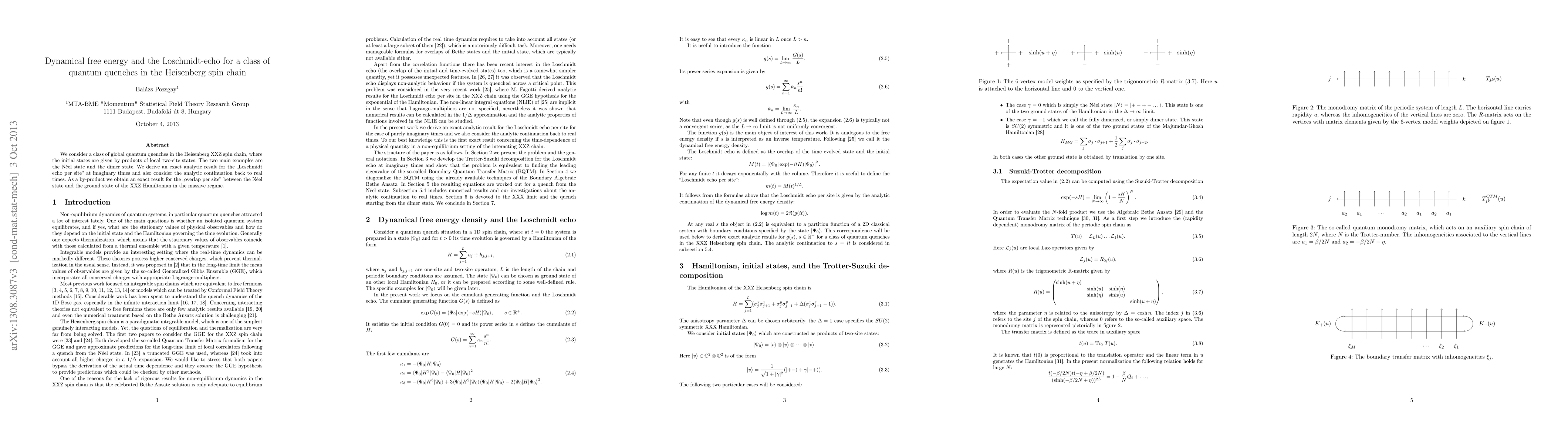 This paper explores global quantum quenches in the Heisenberg XXZ spin chain, deriving an exact analytic result for the Loschmidt echo per site at imaginary times and its continuation to real times. It also provides an exact overlap result between the N\'eel state and the ground state of the XXZ Hamiltonian in the massive regime.