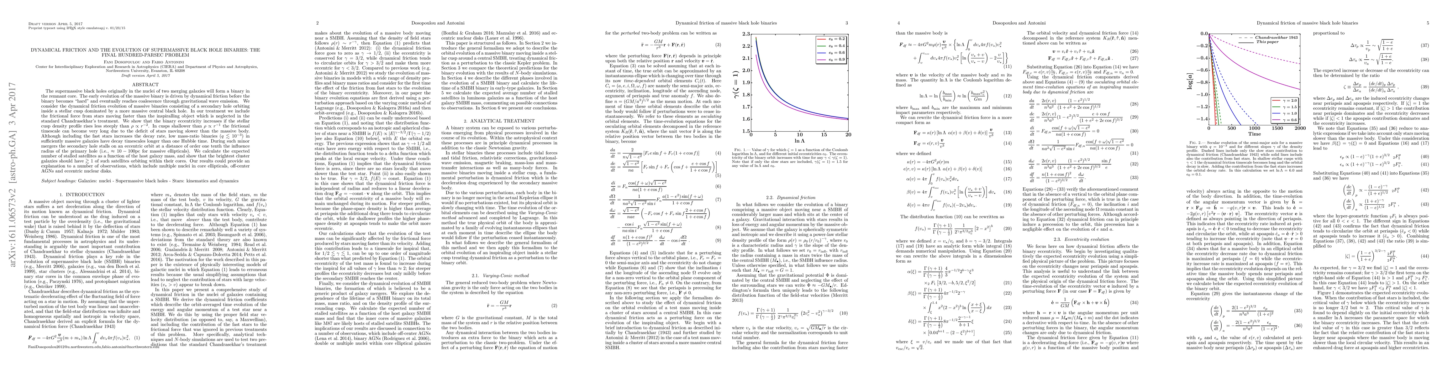 The supermassive black holes originally in the nuclei of two merging galaxies will form a binary in the remnant core. The early evolution of the massive binary is driven by dynamical friction before the binary becomes "hard" and eventually reaches coalescence through gravitational wave emission. { We consider the dynamical friction evolution of massive binaries consisting of a secondary hole orbiting inside a stellar cusp dominated by a more massive central black hole.} In our treatment we include the frictional force from stars moving faster than the inspiralling object which is neglected in the standard Chandrasekhar's treatment. We show that the binary eccentricity increases if the stellar cusp density profile rises less steeply than $\rho\propto r^{-2}$. In cusps shallower than $\rho\propto r^{-1}$ the frictional timescale can become very long due to the deficit of stars moving slower than the massive body. Although including the fast stars increases the decay rate, low mass-ratio binaries ($q\lesssim 10^{-3}$) in sufficiently massive galaxies have decay timescales longer than one Hubble time. During such minor mergers the secondary hole stalls on an eccentric orbit at a distance of order one tenth the influence radius of the primary hole (i.e., $\approx 10-100\rm pc$ for massive ellipticals). We calculate the expected number of stalled satellites as a function of the host galaxy mass, and show that the brightest cluster galaxies should have $\gtrsim 1$ of such satellites orbiting within their cores. Our results could provide an explanation to a number of observations, which include multiple nuclei in core ellipticals, off-center AGNs and eccentric nuclear disks.