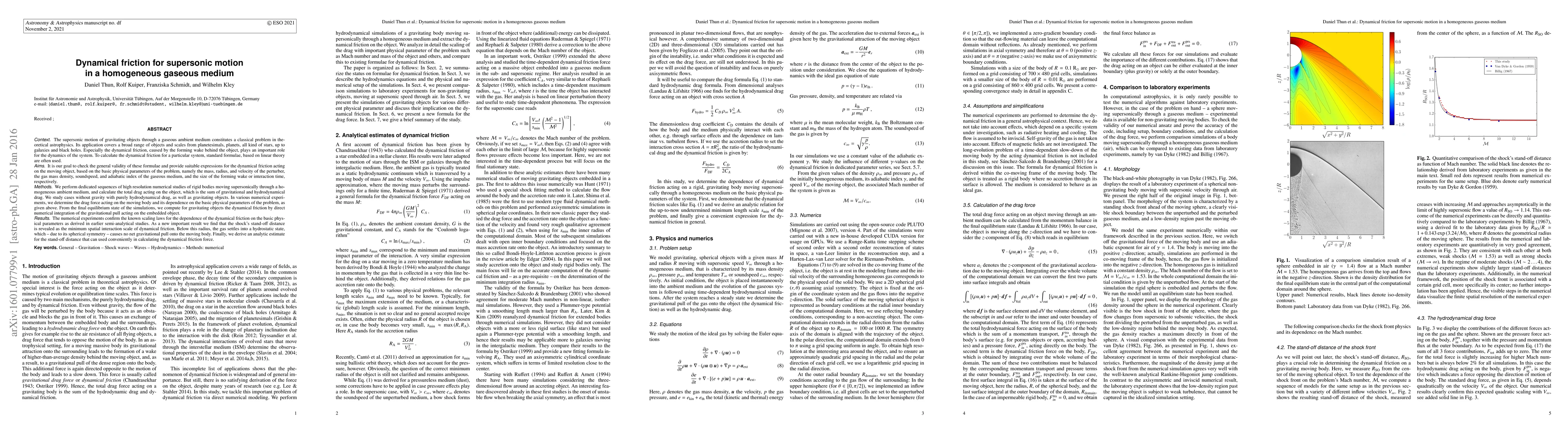 The supersonic motion of gravitating objects through a gaseous medium constitutes a classical problem in theoretical astrophysics. Its application covers a broad range of objects and scales from planets up to galaxies. Especially the dynamical friction, caused by the forming wake behind the object, plays an important role for the dynamics of the system. To calculate the dynamical friction, standard formulae, based on linear theory are often used. It is our goal to check the general validity of these formulae and provide suitable expressions for the dynamical friction acting on the moving object, based on the basic physical parameters of the problem. We perform sequences of high resolution numerical studies of rigid bodies moving supersonically through a homogeneous medium, and calculate the total drag acting on the object, which is the sum of gravitational and hydro drag. We study cases without gravity with purely hydrodynamical drag, as well as gravitating objects. From the final equilibrium state of the simulations, we compute for gravitating objects the dynamical friction by direct numerical integration of the gravitational pull acting on the embedded object. The numerical experiments confirm the known scaling laws for the dependence of the dynamical friction on the basic physical parameters as derived in earlier semi-analytical studies. As a new important result we find that the shock's stand-off distance is revealed as the minimum spatial interaction scale of dynamical friction. Below this radius, the gas settles into a hydrostatic state, which causes no net gravitational pull onto the moving body. Finally, we derive an analytic estimate for the stand-off distance that can be used to calculate the dynamical friction force.