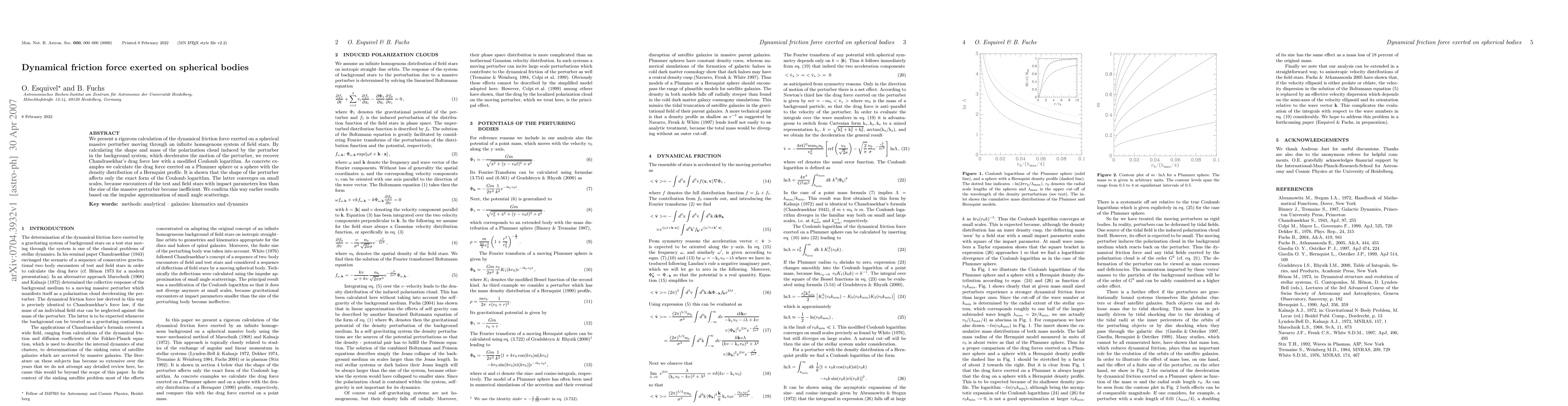 This paper rigorously calculates the dynamical friction force on spherical massive bodies moving through a homogeneous star field, deriving Chandrasekhar's drag force law with a modified Coulomb logarithm. It demonstrates that the shape of the perturber influences only the form of the Coulomb logarithm, which converges on small scales due to inefficient encounters.
