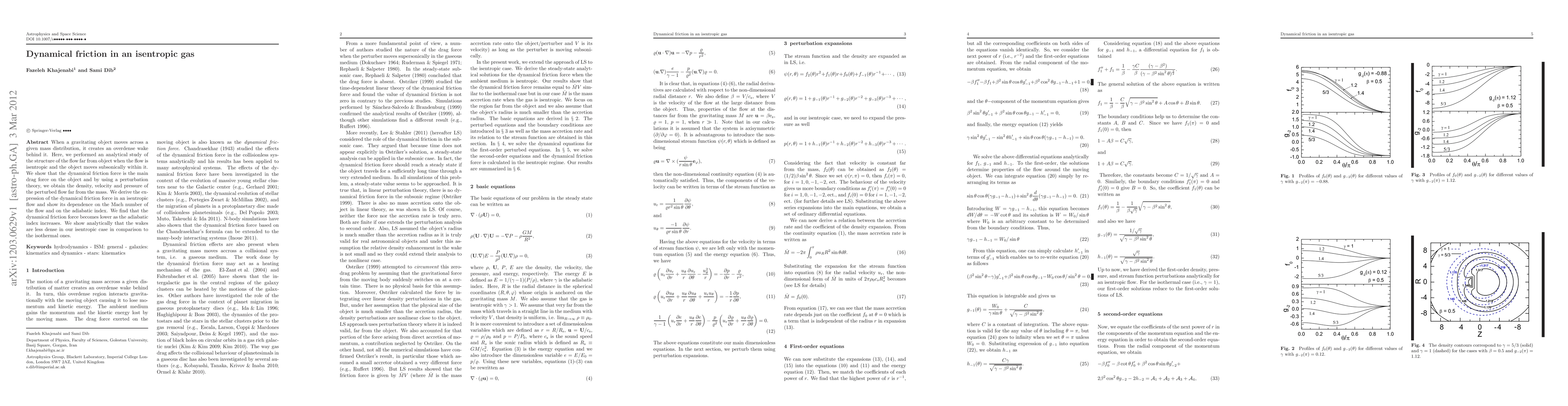 Researchers studied dynamical friction in an isentropic gas when a gravitating object moves through it at subsonic speeds, finding that the force decreases with increasing adiabatic index.