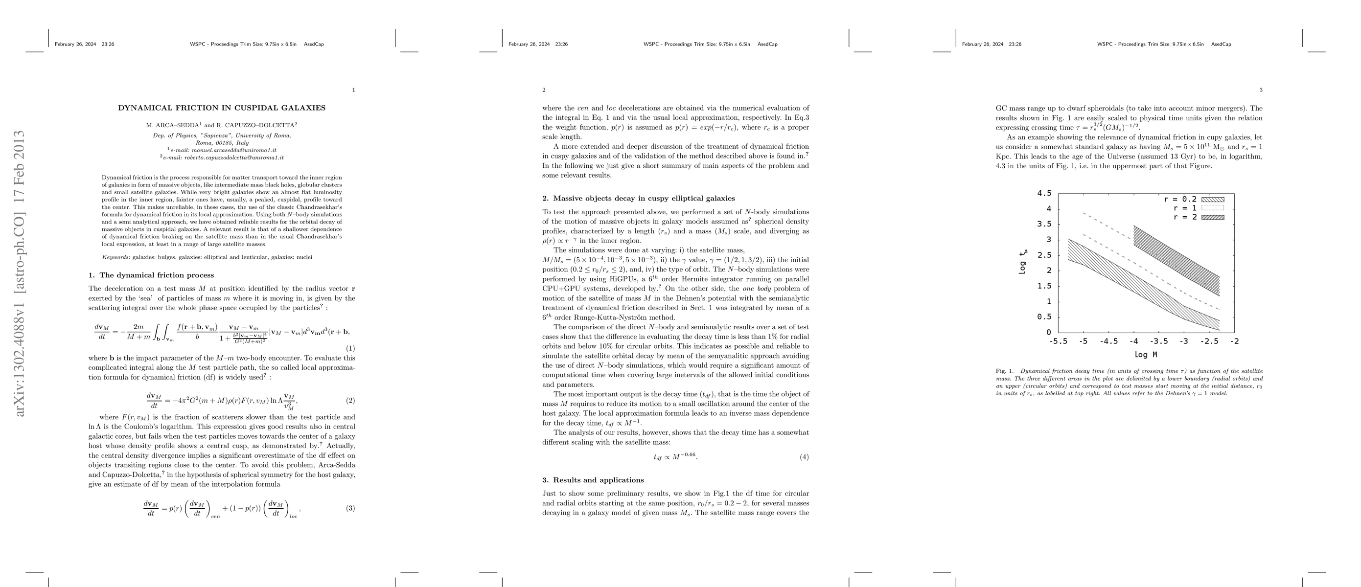 Dynamical friction is the process responsible for matter transport toward the inner regions of galaxies in form of massive objects, like intermediate mass black holes, globular clusters and small satellite galaxies. While very bright galaxies show an almost flat luminosity profile in the inner region, fainter ones have, usually, a peaked, cuspidal, profile toward the center. This makes unreliable, in these cases, the use of the classic Chandrasekhar's formula for dynamical friction in its local approximation. Using both N-body simulations and a semi analytical approach, we have obtained reliable results for the orbital decay of massive objects in cuspidal galaxies. A relevant result is that of a shallower dependence of dynamical friction braking on the satellite mass than in the usual Chandrasekhar's local expression, at least in a range of large satellite masses.