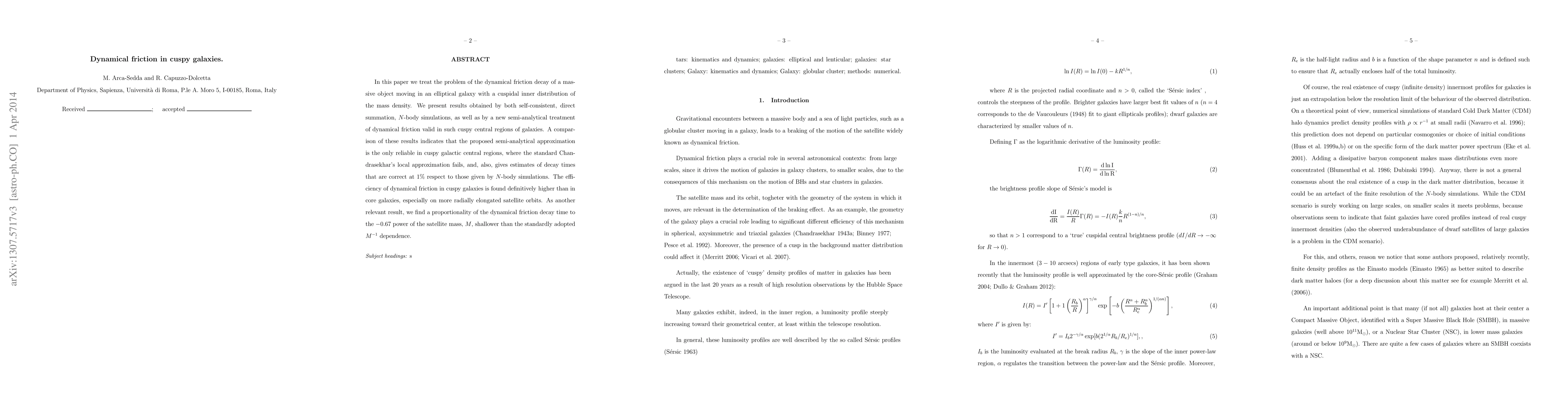 This paper investigates the dynamical friction decay of massive objects in elliptical galaxies with cuspy mass distributions, using both N-body simulations and a new semi-analytical approach. The semi-analytical method is shown to be more reliable in cuspy regions, providing decay time estimates accurate to 1% compared to simulations, and revealing a higher efficiency of dynamical friction in cuspy galaxies.