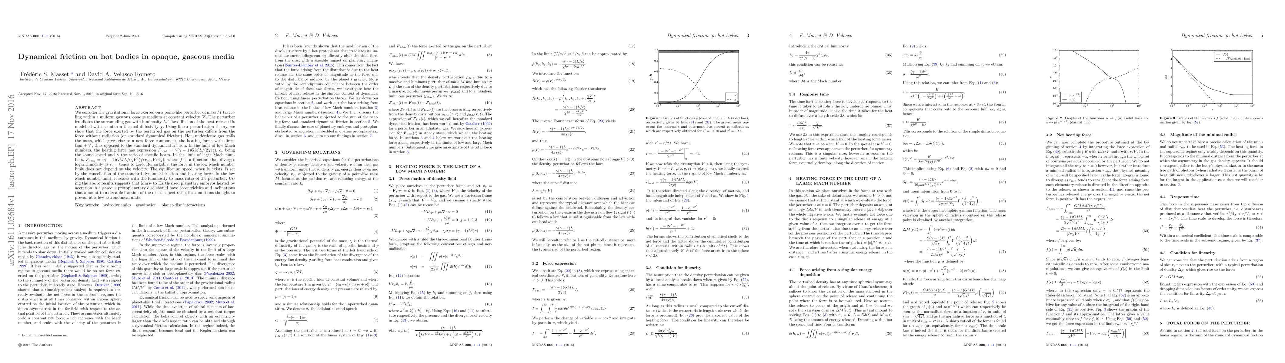 We consider the gravitational force exerted on a point-like perturber of mass $M$ travelling within a uniform gaseous, opaque medium at constant velocity $V$. The perturber irradiates the surrounding gas with luminosity $L$. The diffusion of the heat released is modelled with a uniform thermal diffusivity $\chi$. Using linear perturbation theory, we show that the force exerted by the perturbed gas on the perturber differs from the force without radiation (or standard dynamical friction). Hot, underdense gas trails the mass, which gives rise to a new force component, the heating force, with direction $+V$, thus opposed to the standard dynamical friction. In the limit of low Mach numbers, the heating force has expression $F_\mathrm{heat}=\gamma(\gamma-1)GML/(2\chi c_s^2)$, $c_s$ being the sound speed and $\gamma$ the ratio of specific heats. In the limit of large Mach numbers, $F_\mathrm{heat}=(\gamma-1)GML/(\chi V^2)f(r_\mathrm{min}V/4\chi)$, where $f$ is a function that diverges logarithmically as $r_\mathrm{min}$ tends to zero. Remarkably, the force in the low Mach number limit does not depend on the velocity. The equilibrium speed, when it exists, is set by the cancellation of the standard dynamical friction and heating force. In the low Mach number limit, it scales with the luminosity to mass ratio of the perturber. Using the above results suggests that Mars- to Earth-sized planetary embryos heated by accretion in a gaseous protoplanetary disc should have eccentricities and inclinations that amount to a sizeable fraction of the disc's aspect ratio, for conditions thought to prevail at a few astronomical units.