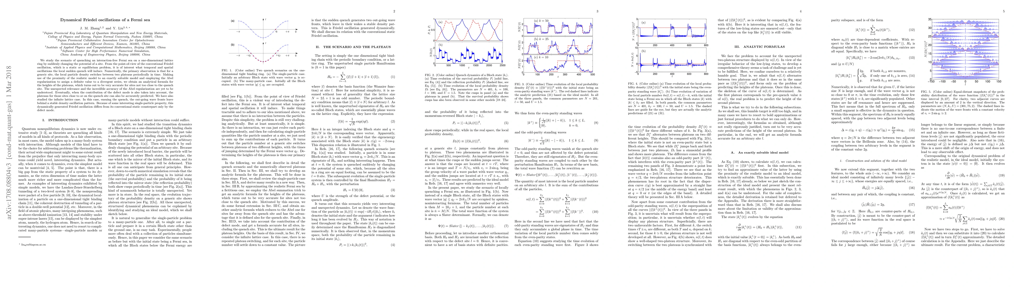 We study the scenario of quenching an interaction-free Fermi sea on a one-dimensional lattice ring by suddenly changing the potential of a site. From the point-of-view of the conventional Friedel oscillation, which is a static or equilibrium problem, it is of interest what temporal and spatial oscillations the local sudden quench will induce. Numerically, the primary observation is that for a generic site, the local particle density switches between two plateaus periodically in time. Making use of the proximity of the realistic model to an exactly solvable model and employing the {Abel regularization} to assign a definite value to a divergent series, we obtain an analytical formula for the heights of the plateaus, which turns out to be very accurate for sites not too close to the quench site. The unexpected relevance and the incredible accuracy of the Abel regularization are yet to be understood. Eventually, when the contribution of the defect mode is also taken into account, the plateaus for those sites close to or on the quench site can also be accurately predicted. We have also studied the infinite lattice case. In this case, ensuing the quench, the out-going wave fronts leave behind a stable density oscillation pattern. Because of some interesting single-particle property, this dynamically generated Friedel oscillation differs from its conventional static counterpart only by the defect mode.