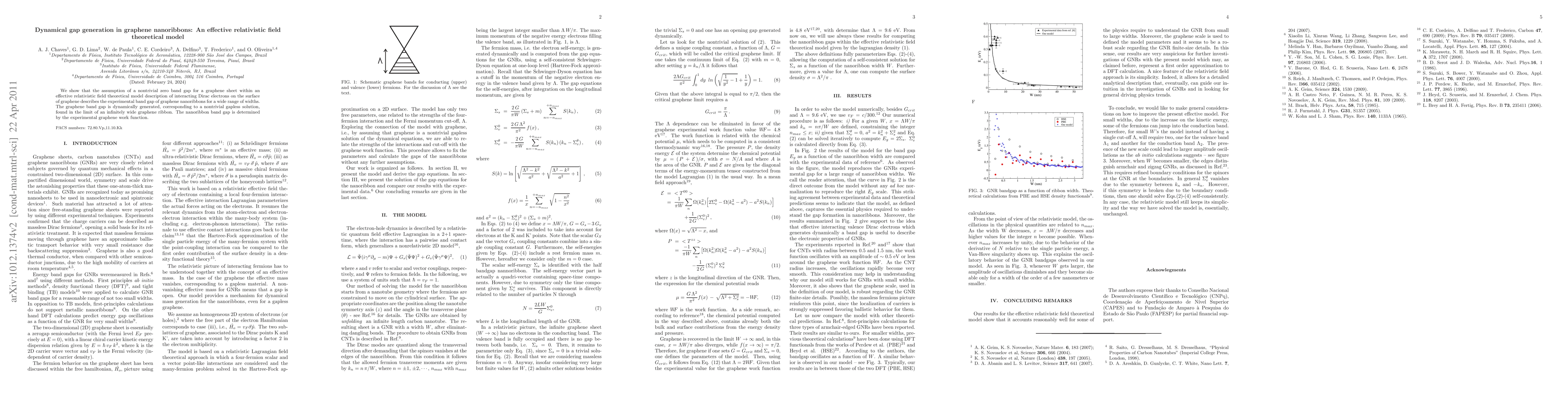We show that the assumption of a nontrivial zero band gap for a graphene sheet within an effective relativistic field theoretical model description of interacting Dirac electrons on the surface of graphene describes the experimental band gap of graphene nanoribbons for a wide range of widths. The graphene band gap is dynamically generated, corresponding to a nontrivial gapless solution, found in the limit of an infinitely wide graphene ribbon. The nanoribbon band gap is determined by the experimental graphene work function.