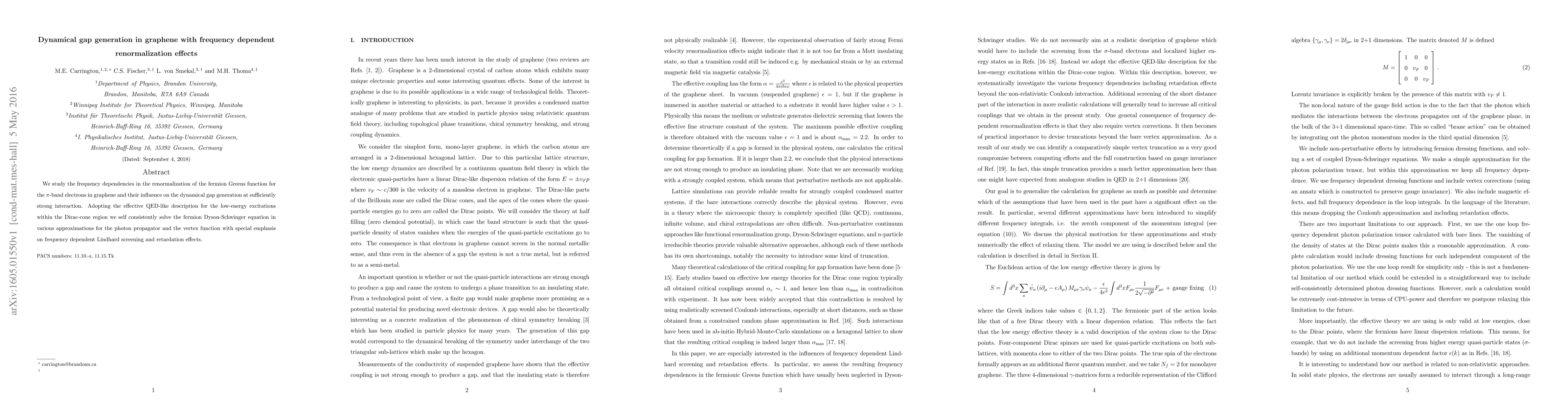 This paper investigates how frequency-dependent renormalization affects the fermion Green's function in graphene's π-band, leading to the generation of a dynamical gap under strong interaction. The study employs an effective QED-like approach to solve the fermion Dyson-Schwinger equation, focusing on frequency-dependent screening and retardation effects.