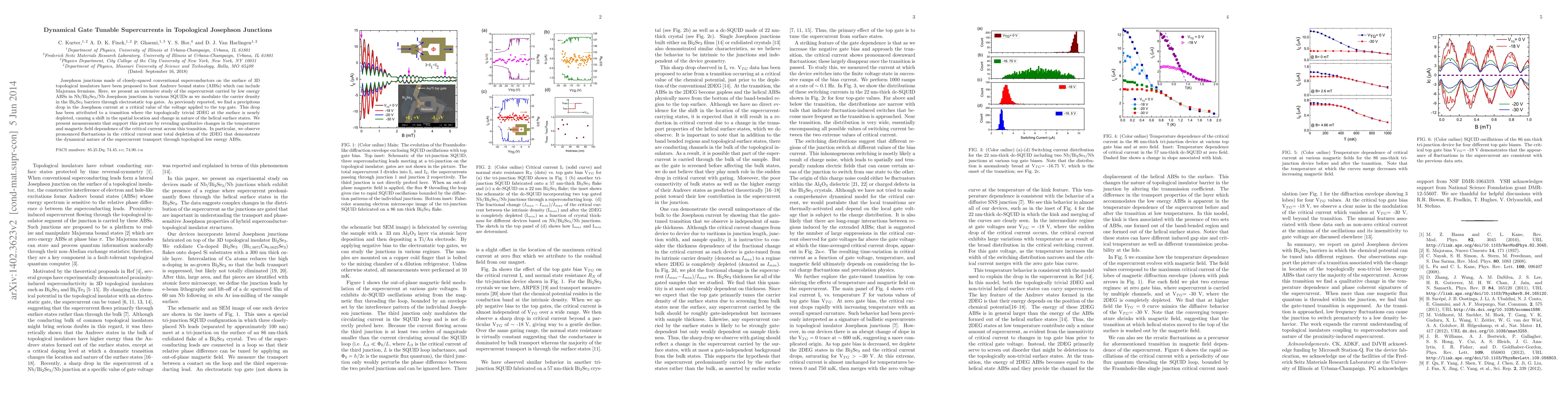 The research investigates Nb/Bi2Se3/Nb Josephson junctions, finding a significant decrease in supercurrent when the carrier density in Bi2Se3 barriers is altered via electrostatic gates. This drop corresponds to a transition from a topologically trivial 2DEG to helical surface states, supported by temperature and magnetic field dependence observations. The study reveals the dynamical nature of supercurrent transport through topological low-energy Andreev bound states.