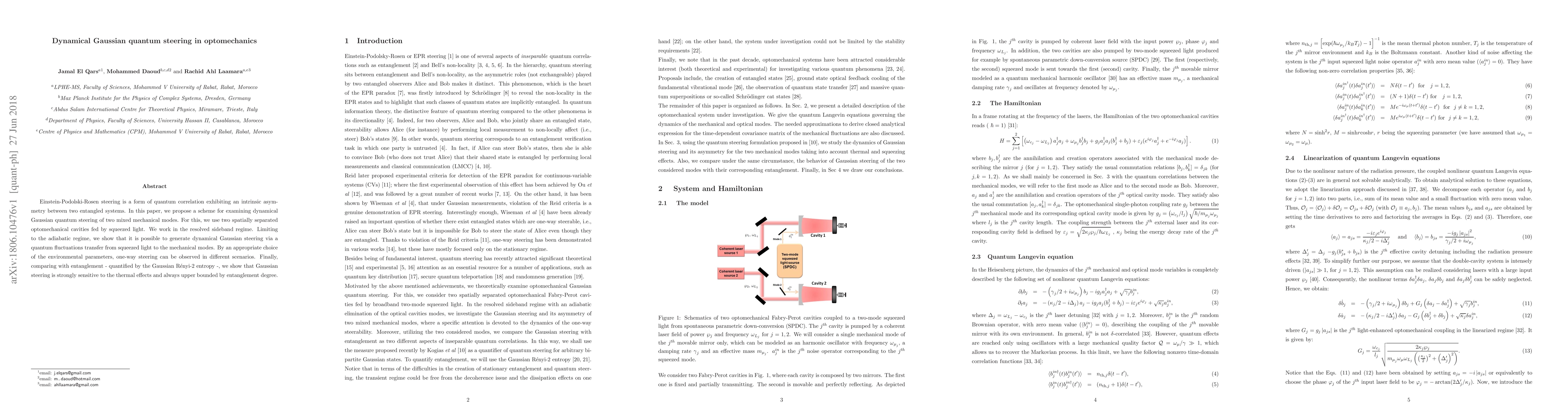 Einstein-Podolski-Rosen steering is a form of quantum correlation exhibiting an intrinsic asymmetry between two entangled systems. In this paper, we propose a scheme for examining dynamical Gaussian quantum steering of two mixed mechanical modes. For this, we use two spatially separated optomechanical cavities fed by squeezed light. We work in the resolved sideband regime. Limiting to the adiabatic regime, we show that it is possible to generate dynamical Gaussian steering via a quantum fluctuations transfer from squeezed light to the mechanical modes. By an appropriate choice of the environmental parameters, one-way steering can be observed in different scenarios. Finally, comparing with entanglement - quantified by the Gaussian R\'enyi-2 entropy-, we show that Gaussian steering is strongly sensitive to the thermal effects and always upper bounded by entanglement degree.