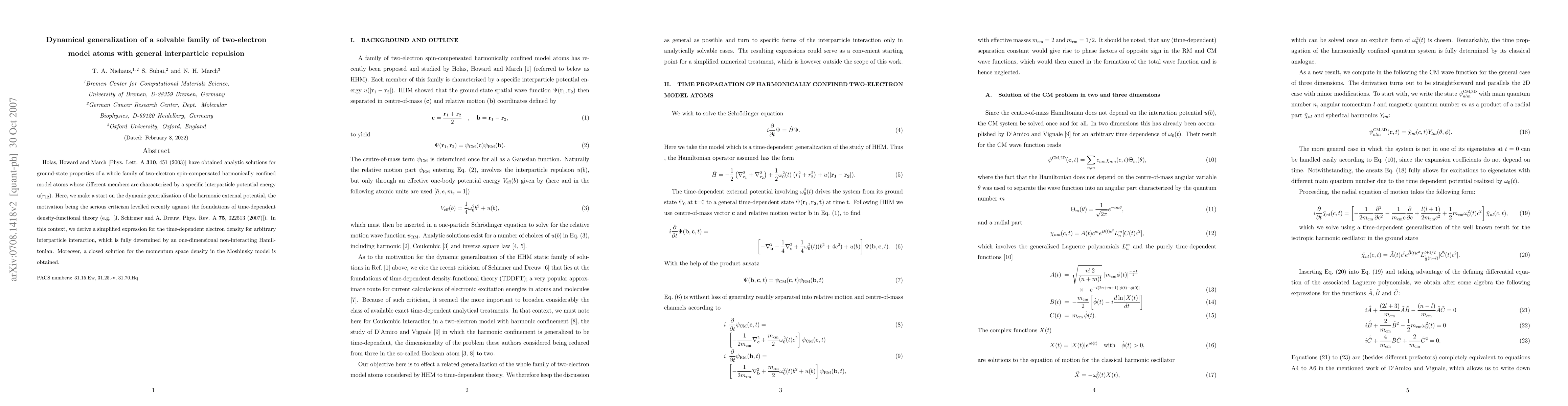 Holas, Howard and March [Phys. Lett. A {\bf 310}, 451 (2003)] have obtained analytic solutions for ground-state properties of a whole family of two-electron spin-compensated harmonically confined model atoms whose different members are characterized by a specific interparticle potential energy u($r_{12}$). Here, we make a start on the dynamic generalization of the harmonic external potential, the motivation being the serious criticism levelled recently against the foundations of time-dependent density-functional theory (e.g. [J. Schirmer and A. Dreuw, Phys. Rev. A {\bf 75}, 022513 (2007)]). In this context, we derive a simplified expression for the time-dependent electron density for arbitrary interparticle interaction, which is fully determined by an one-dimensional non-interacting Hamiltonian. Moreover, a closed solution for the momentum space density in the Moshinsky model is obtained.