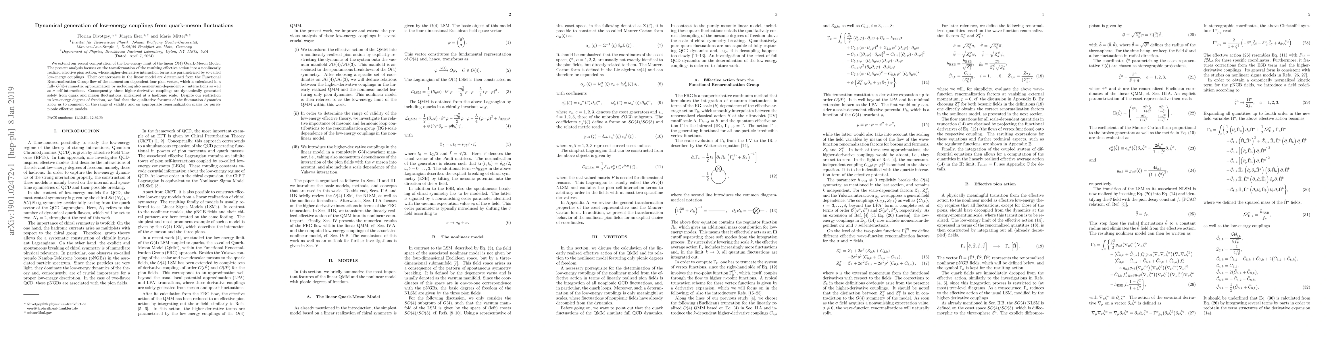 This paper extends the analysis of the linear O(4) Quark-Meson Model to generate low-energy couplings through nonlinear pion interactions, dynamically derived from quark and meson fluctuations. The study uses Functional Renormalization Group to calculate higher-derivative terms, providing insights into the validity and renormalization scales for purely pionic effective models.