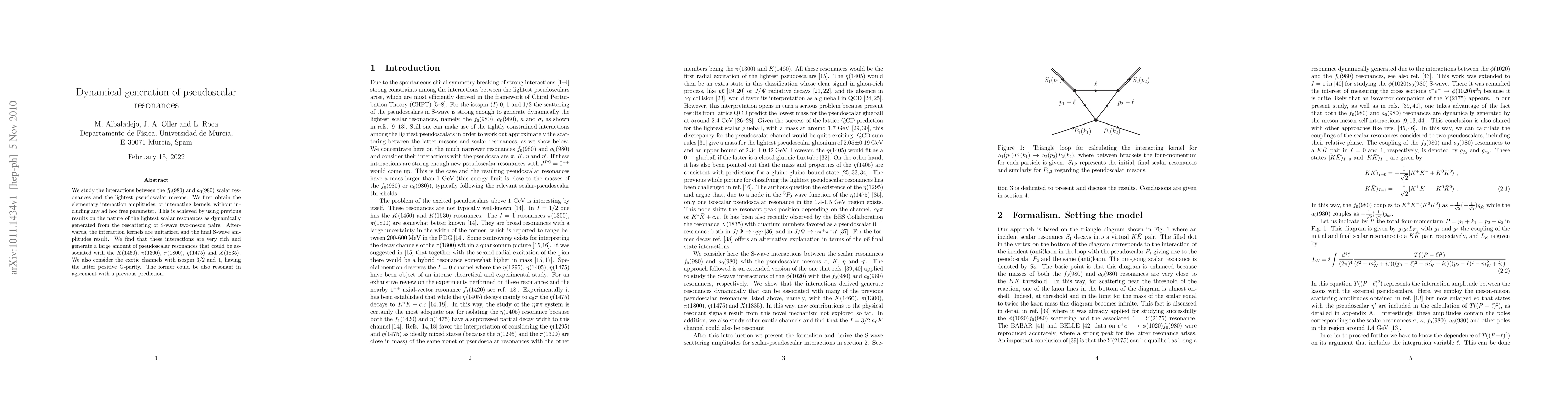 Researchers studied interactions between scalar resonances and lightest pseudoscalar mesons, predicting 5 known and exotic resonances, and demonstrating dynamically generated pseudoscalars.