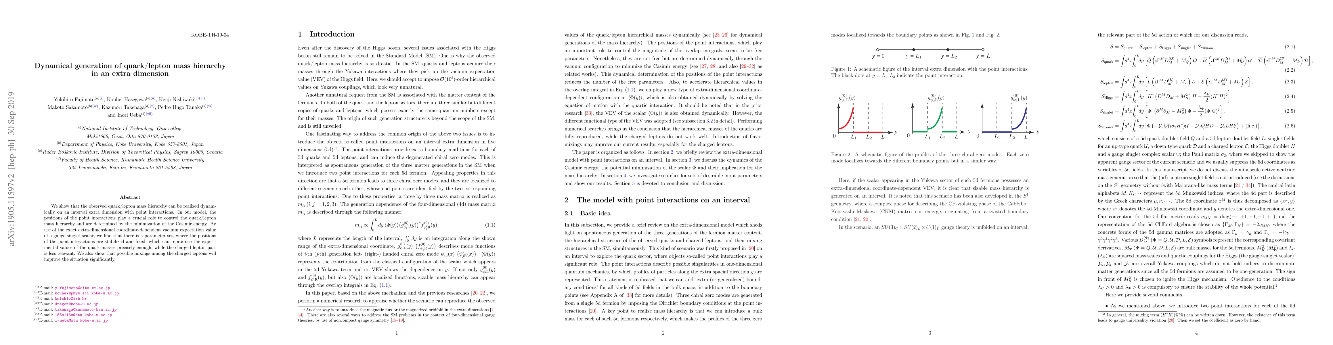 This paper proposes a model where the quark/lepton mass hierarchy is dynamically generated in an extra dimension using point interactions. The positions of these interactions, determined by minimizing Casimir energy, precisely reproduce experimental quark masses, while lepton masses are less constrained, with potential improvements from lepton mixings.