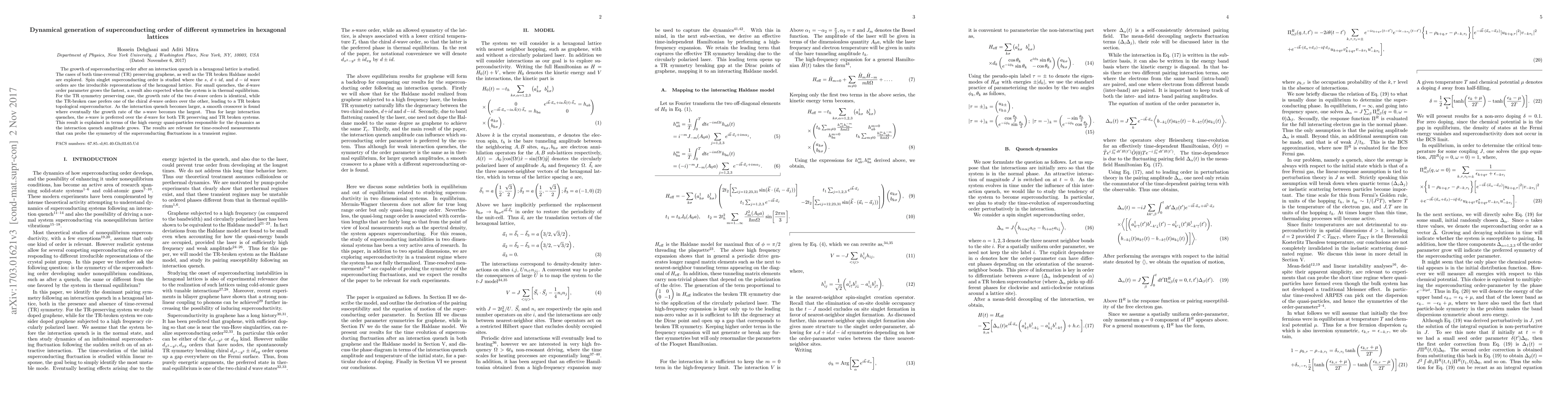 The growth of superconducting order after an interaction quench in a hexagonal lattice is studied. The cases of both time-reversal (TR) preserving graphene, as well as the TR broken Haldane model are explored. Spin singlet superconducting order is studied where the $s$, $d+id$, and $d-id$ wave orders are the irreducible representations of the hexagonal lattice. For small quenches, the $d$-wave order parameter grows the fastest, a result also expected when the system is in thermal equilibrium. For the TR symmetry preserving case, the growth rate of the two $d$-wave orders is identical, while the TR-broken case prefers one of the chiral $d$-wave orders over the other, leading to a TR broken topological superconductor. As the interaction quench becomes larger, a smooth crossover is found where eventually the growth rate of the $s$-wave becomes the largest. Thus for large interaction quenches, the $s$-wave is preferred over the $d$-wave for both TR preserving and TR broken systems. This result is explained in terms of the high energy quasi-particles responsible for the dynamics as the interaction quench amplitude grows. The results are relevant for time-resolved measurements that can probe the symmetry of the superconducting fluctuations in a transient regime.