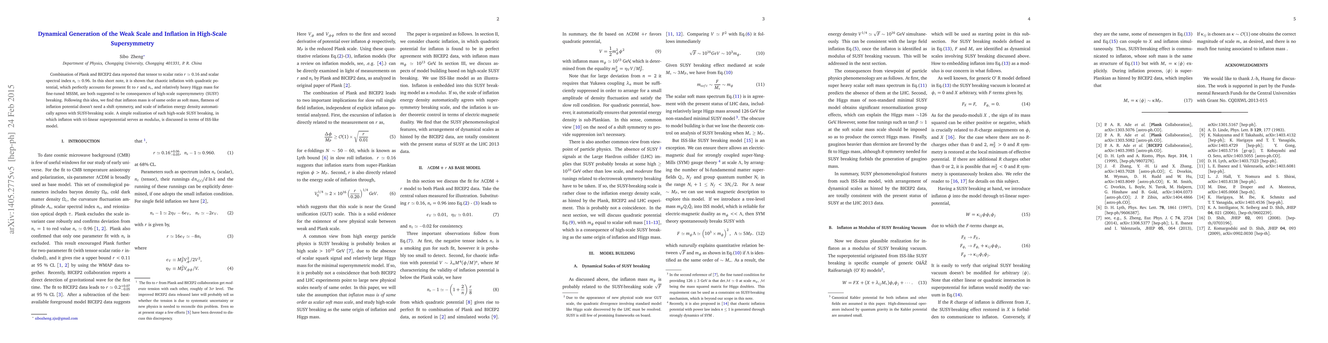 This paper explores how high-scale supersymmetry breaking can naturally explain the observed weak scale and inflationary dynamics, with chaotic inflation driven by a quadratic potential. It suggests that the inflaton mass aligns with soft mass terms, and the inflation energy scale coincides with the SUSY-breaking scale, offering a simple ISS-like model for such scenarios.