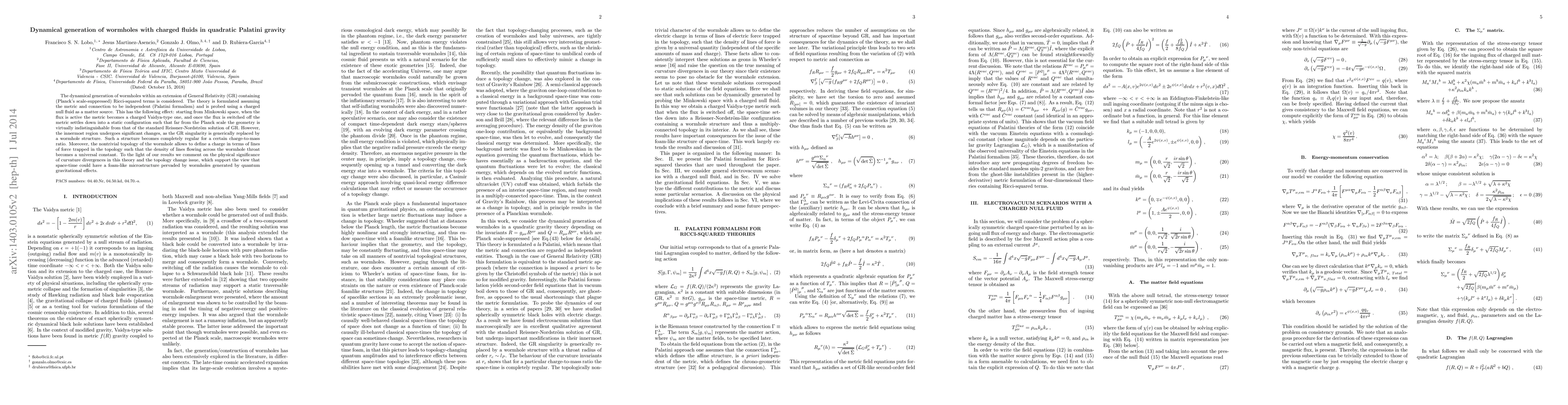 This research explores the creation of wormholes using charged fluids in a modified gravity theory with Ricci-squared terms. By employing the Palatini formalism, they find that starting from Minkowski space and activating the flux results in a charged Vaidya-type metric, which then transitions to a regular wormhole structure when the flux is switched off. This wormhole maintains a charge defined by lines of force trapped in its topology, suggesting that space-time may have a foam-like structure with wormholes generated by quantum gravitational effects.