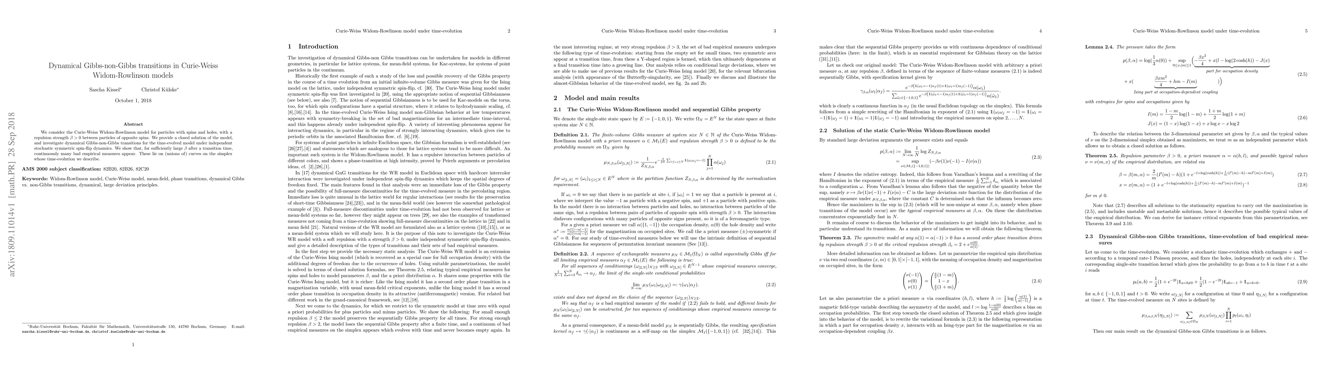 This paper studies the Curie-Weiss Widom-Rowlinson model with spin and hole particles, providing a closed solution and analyzing dynamical Gibbs-non-Gibbs transitions under stochastic spin-flip dynamics. It reveals that for large repulsion strength, multiple bad empirical measures emerge after a transition time, forming curves on the simplex.