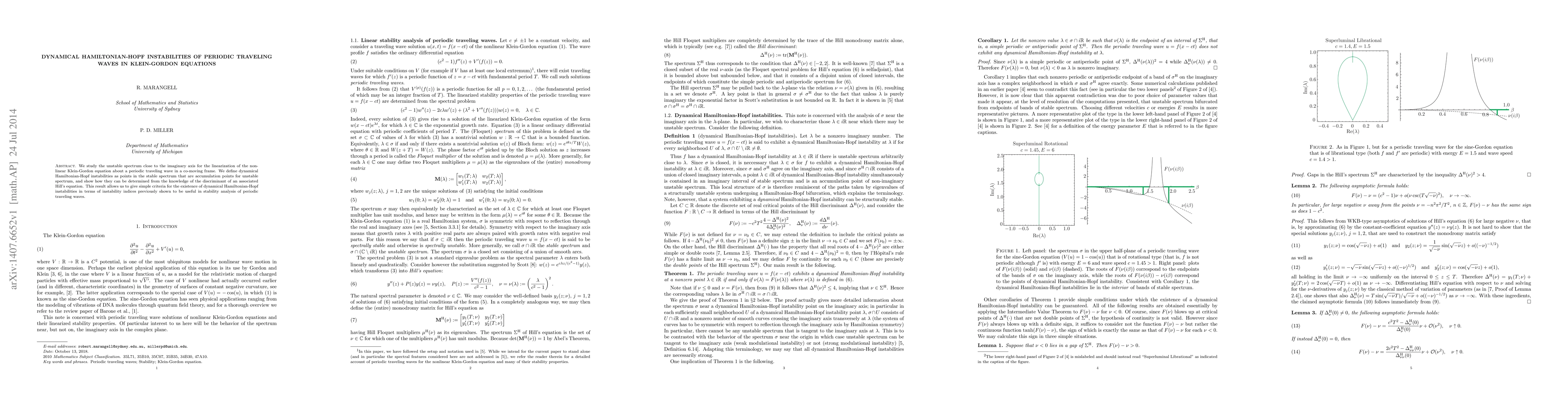 This paper investigates the unstable spectrum near the imaginary axis for the linearization of the nonlinear Klein-Gordon equation around a periodic traveling wave. It defines dynamical Hamiltonian-Hopf instabilities and provides criteria for their existence based on the discriminant of an associated Hill's equation.