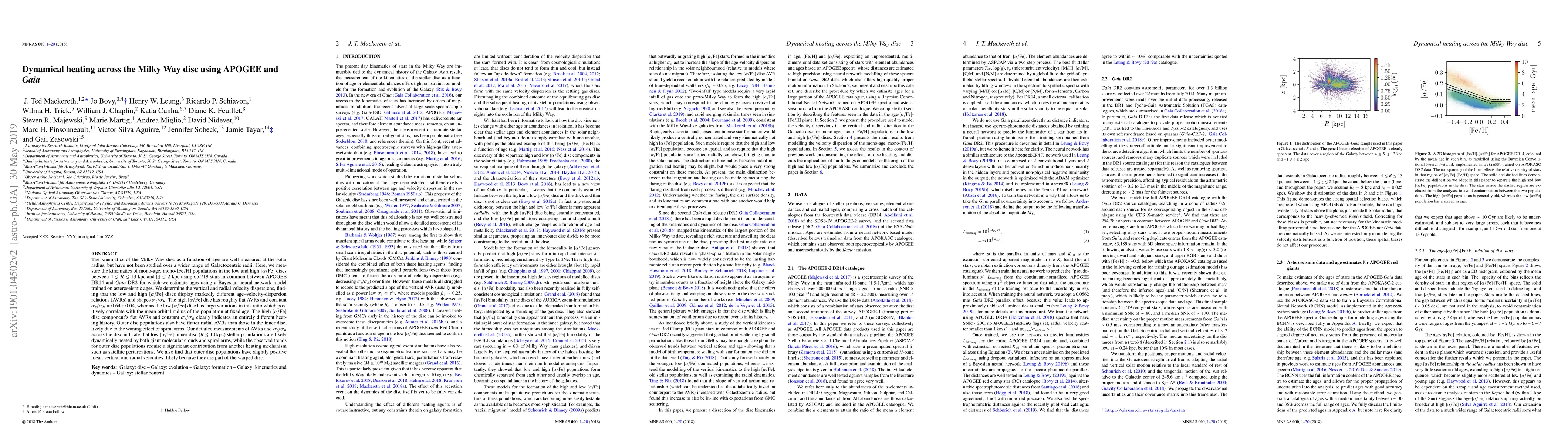 This study uses APOGEE and Gaia data to measure kinematics across the Milky Way disc, revealing different age-velocity-dispersion relations and heating mechanisms for low and high [alpha/Fe] discs.