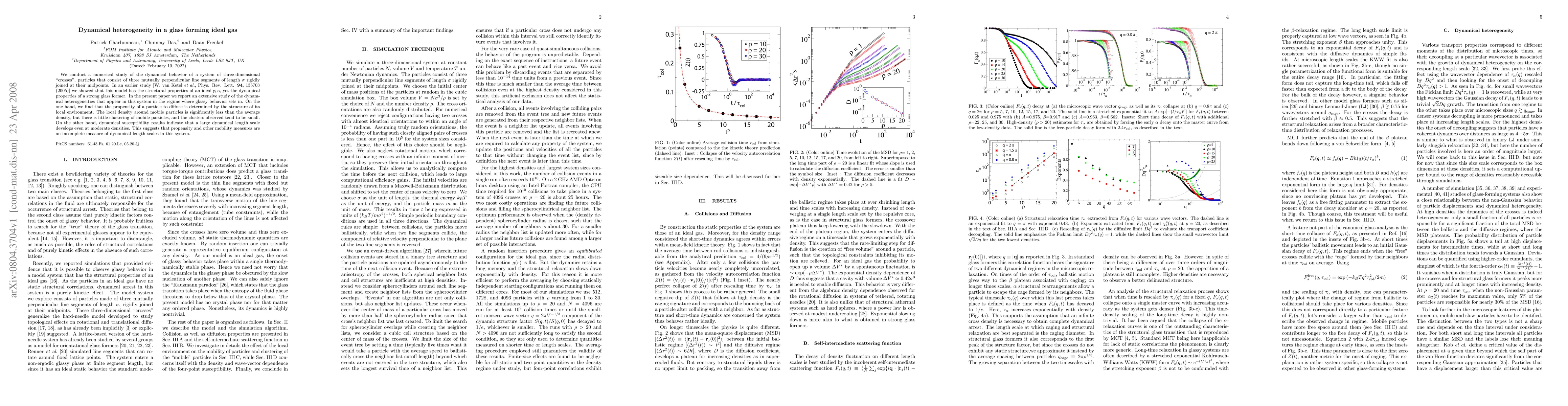 We conduct a numerical study of the dynamical behavior of a system of three-dimensional crosses, particles that consist of three mutually perpendicular line segments rigidly joined at their midpoints. In an earlier study [W. van Ketel et al., Phys. Rev. Lett. 94, 135703 (2005)] we showed that this model has the structural properties of an ideal gas, yet the dynamical properties of a strong glass former. In the present paper we report an extensive study of the dynamical heterogeneities that appear in this system in the regime where glassy behavior sets in. On the one hand, we find that the propensity of a particle to diffuse is determined by the structure of its local environment. The local density around mobile particles is significantly less than the average density, but there is little clustering of mobile particles, and the clusters observed tend to be small. On the other hand, dynamical susceptibility results indicate that a large dynamical length scale develops even at moderate densities. This suggests that propensity and other mobility measures are an incomplete measure of dynamical length scales in this system.