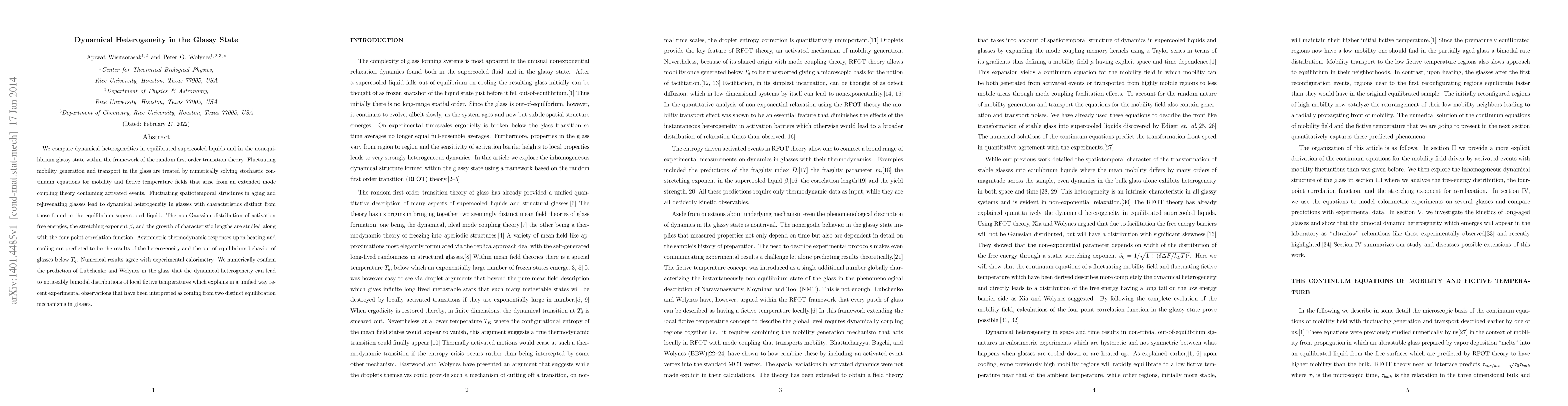 We compare dynamical heterogeneities in equilibrated supercooled liquids and in the nonequilibrium glassy state within the framework of the random first order transition theory. Fluctuating mobility generation and transport in the glass are treated by numerically solving stochastic continuum equations for mobility and fictive temperature fields that arise from an extended mode coupling theory containing activated events. Fluctuating spatiotemporal structures in aging and rejuvenating glasses lead to dynamical heterogeneity in glasses with characteristics distinct from those found in the equilibrium supercooled liquid. The non-Gaussian distribution of activation free energies, the stretching exponent $\beta$, and the growth of characteristic lengths are studied along with the four-point correlation function. Asymmetric thermodynamic responses upon heating and cooling are predicted to be the results of the heterogeneity and the out-of-equilibrium behavior of glasses below $T_g$. Numerical results agree with experimental calorimetry. We numerically confirm the prediction of Lubchenko and Wolynes in the glass that the dynamical heterogeneity can lead to noticeably bimodal distributions of local fictive temperatures which explains in a unified way recent experimental observations that have been interpreted as coming from two distinct equilibration mechanisms in glasses.