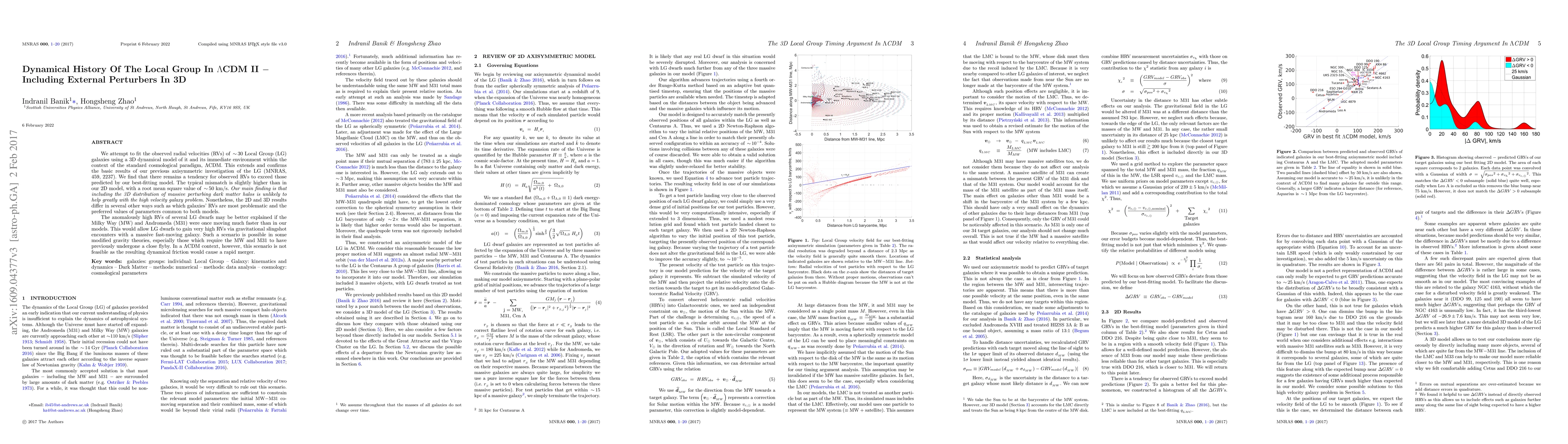 We attempt to fit the observed radial velocities (RVs) of ${\,{\sim}\,}30$ Local Group (LG) galaxies using a 3D dynamical model of it and its immediate environment within the context of the standard cosmological paradigm, $\Lambda$CDM. This extends and confirms the basic results of our previous axisymmetric investigation of the LG (MNRAS, 459, 2237). We find that there remains a tendency for observed RVs to exceed those predicted by our best-fitting model. The typical mismatch is slightly higher than in our 2D model, with a root mean square value of ${\,{\sim}\,}50$ km/s. Our main finding is that including the 3D distribution of massive perturbing dark matter halos is unlikely to help greatly with the high velocity galaxy problem. Nonetheless, the 2D and 3D results differ in several other ways such as which galaxies' RVs are most problematic and the preferred values of parameters common to both models. The anomalously high RVs of several LG dwarfs may be better explained if the Milky Way (MW) and Andromeda (M31) were once moving much faster than in our models. This would allow LG dwarfs to gain very high RVs via gravitational slingshot encounters with a massive fast-moving galaxy. Such a scenario is possible in some modified gravity theories, especially those which require the MW and M31 to have previously undergone a close flyby. In a $\Lambda$CDM context, however, this scenario is not feasible as the resulting dynamical friction would cause a rapid merger.