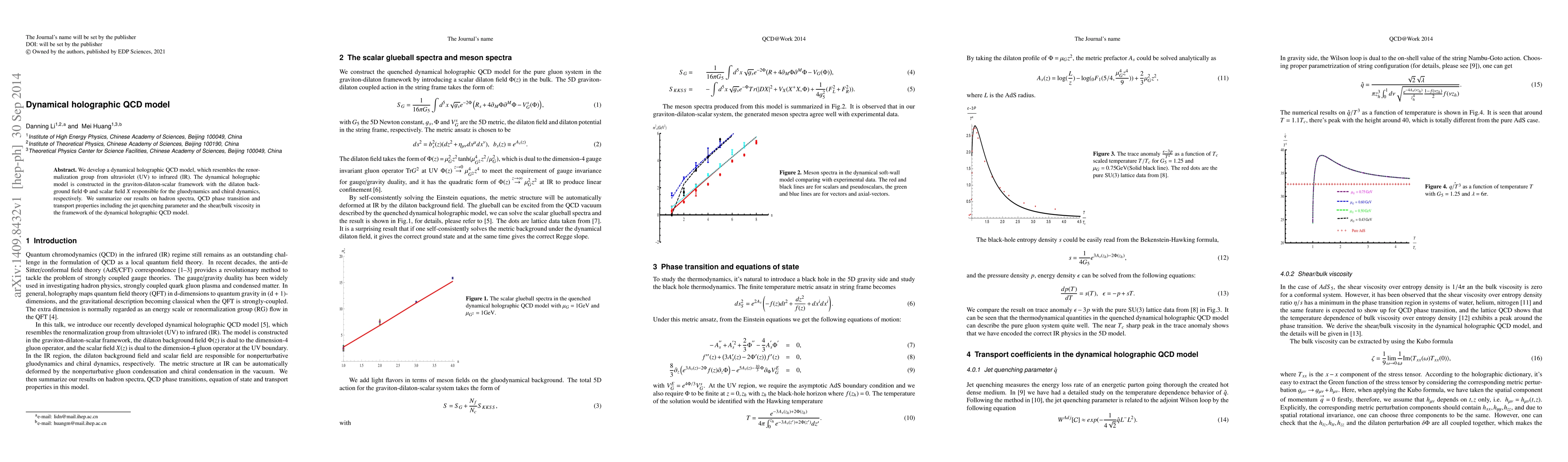 This paper introduces a dynamical holographic QCD model utilizing a graviton-dilaton-scalar framework to simulate the renormalization group flow. It analyzes hadron spectra, QCD phase transitions, and transport properties, including jet quenching and viscosity.