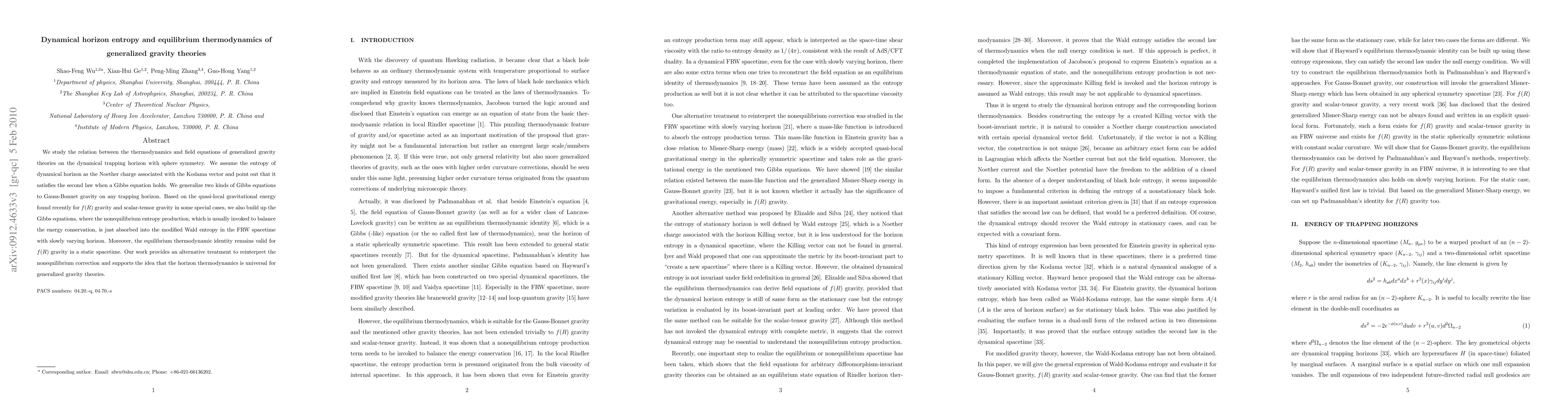 We study the relation between the thermodynamics and field equations of generalized gravity theories on the dynamical trapping horizon with sphere symmetry. We assume the entropy of dynamical horizon as the Noether charge associated with the Kodama vector and point out that it satisfies the second law when a Gibbs equation holds. We generalize two kinds of Gibbs equations to Gauss-Bonnet gravity on any trapping horizon. Based on the quasi-local gravitational energy found recently for $f(R)$ gravity and scalar-tensor gravity in some special cases, we also build up the Gibbs equations, where the nonequilibrium entropy production, which is usually invoked to balance the energy conservation, is just absorbed into the modified Wald entropy in the FRW spacetime with slowly varying horizon. Moreover, the equilibrium thermodynamic identity remains valid for $f(R)$ gravity in a static spacetime. Our work provides an alternative treatment to reinterpret the nonequilibrium correction and supports the idea that the horizon thermodynamics is universal for generalized gravity theories.