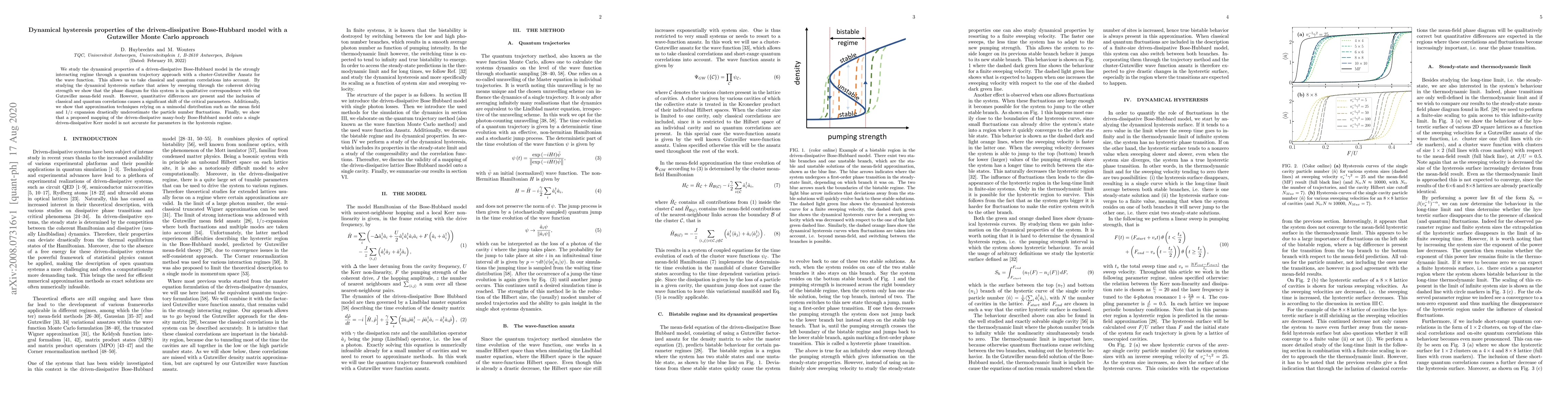This paper investigates the dynamical hysteresis properties of a driven-dissipative Bose-Hubbard model using a Gutzwiller Monte Carlo approach, revealing significant shifts in critical parameters due to classical and quantum correlations, and demonstrating that approximations like mean field and $1/z$ expansion poorly capture particle number fluctuations.